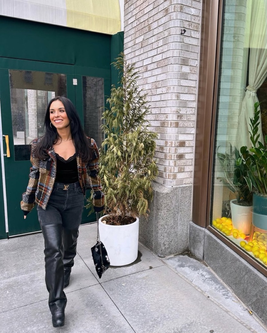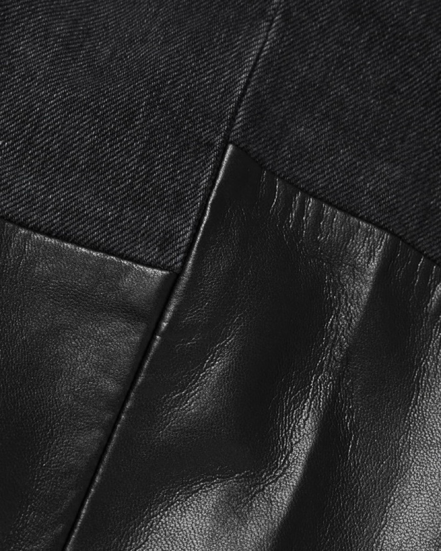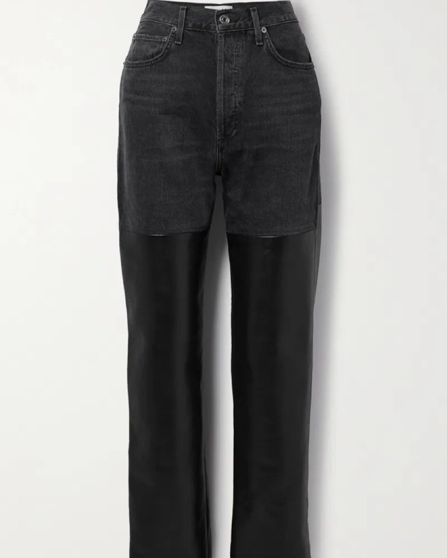 These leather AGOLDE jeans are so chic and trendy. With a high waisted fit, these black pants are sure to make a statement. The black denim compliments the straight leg leather bottoms. It’s perfect for going out, work, western trips & more. I also have these in blue jean & leather in my closet.