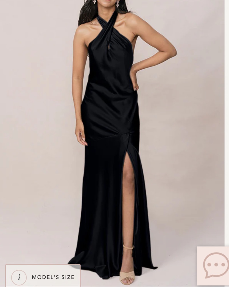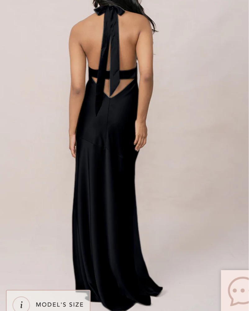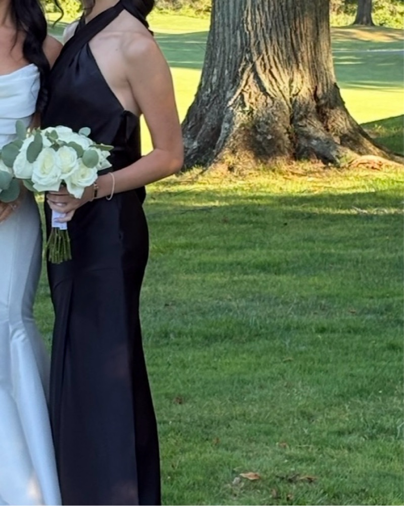 Black halter neck, Revelry Athena satin bridesmaids dress. I had the cups/wiring around the ribcage removed so it falls more naturally