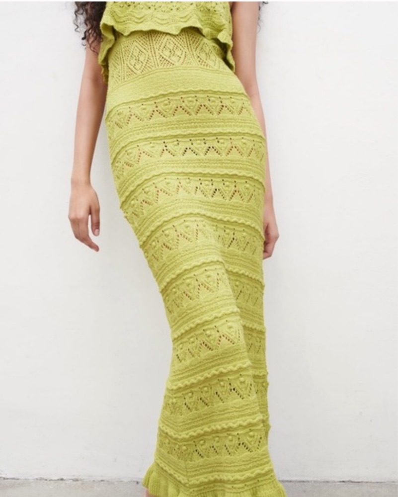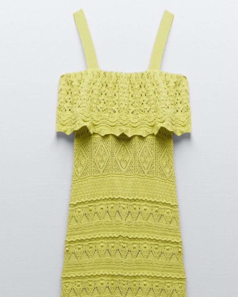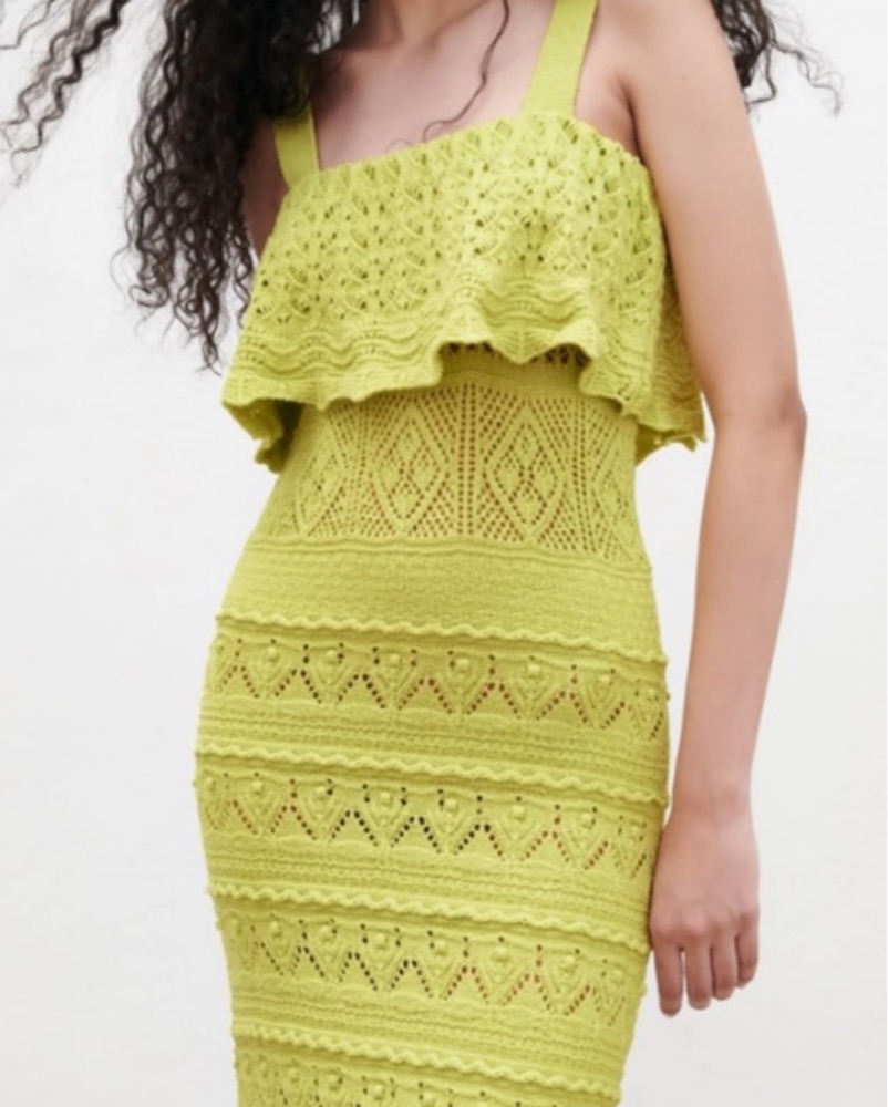 This stunning crochet midi dress in a vibrant lime green hue is perfect for a summer garden party or evening stroll. The intricate lace detailing and flowy silhouette create a feminine, elegant look.