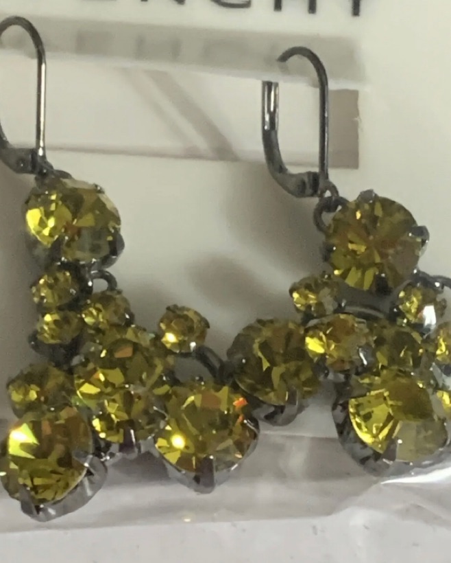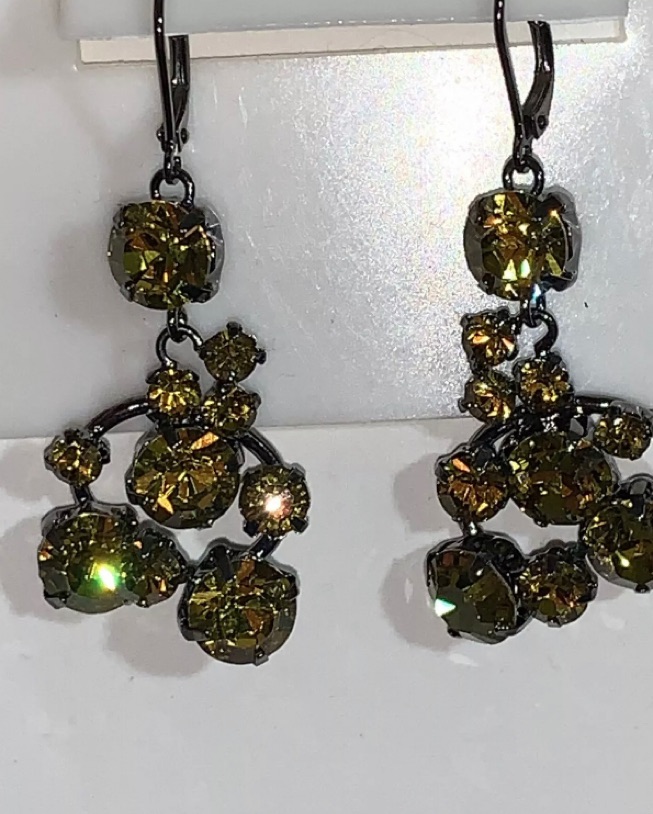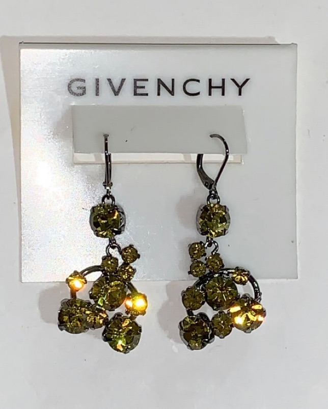 pre-loved, authentic, GIVENCHY chandalier drop earrings set with golden-yellow Swarovski crystals in antique gunmetal silver wire hook setting. Wire hooks have hinged safety clasp. MINT CONDITION.