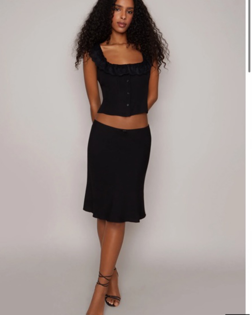 Super cute low rise skirt and top set! Perfect condition, can be dressed up or down. Size small skirt and XS top in black. Sizing: Top runs small, fits an A/B cup, can be unbuttoned. Skirt is TTS, fits an XS as it can be worn low waisted