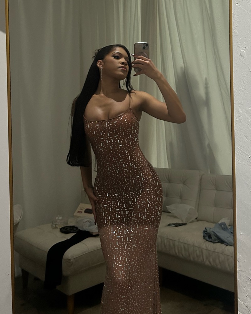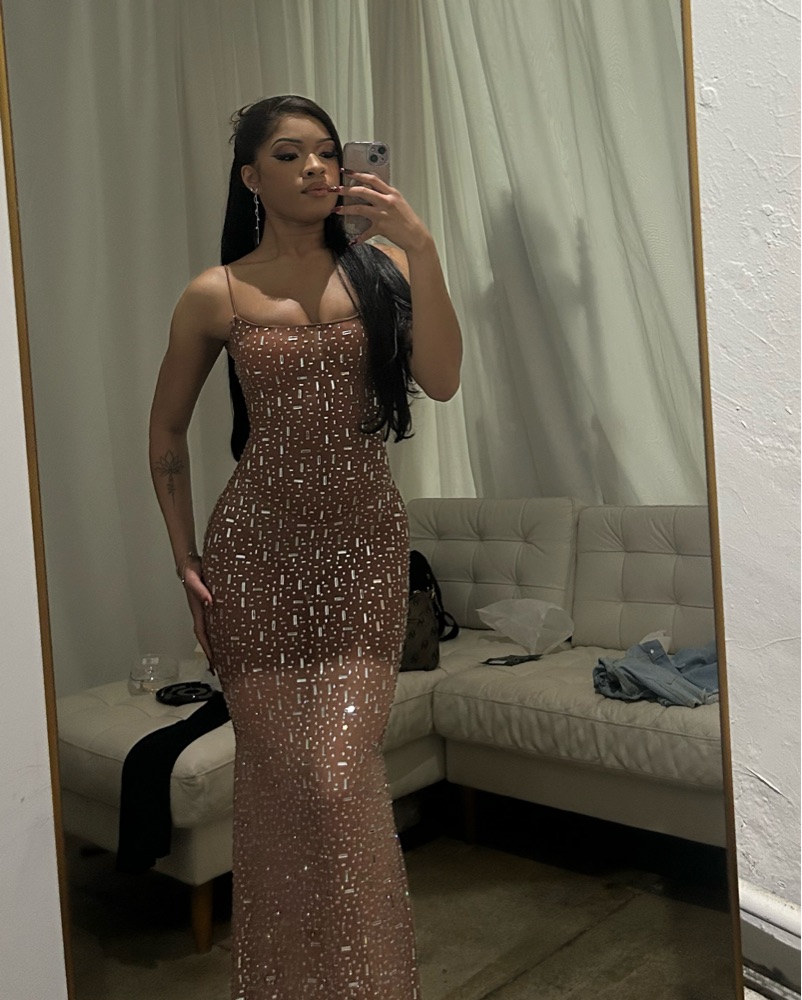 The viral sheer embellished scoop neck evening gown from Oh Polly is now available to rent! Only worn once for a birthday shoot✨This stunning maxi dress is perfect for a night out or a birthday. This dress is a size 0. I am 5’4 and usually wear an xs to a small. Hips:36in Waist:25 in