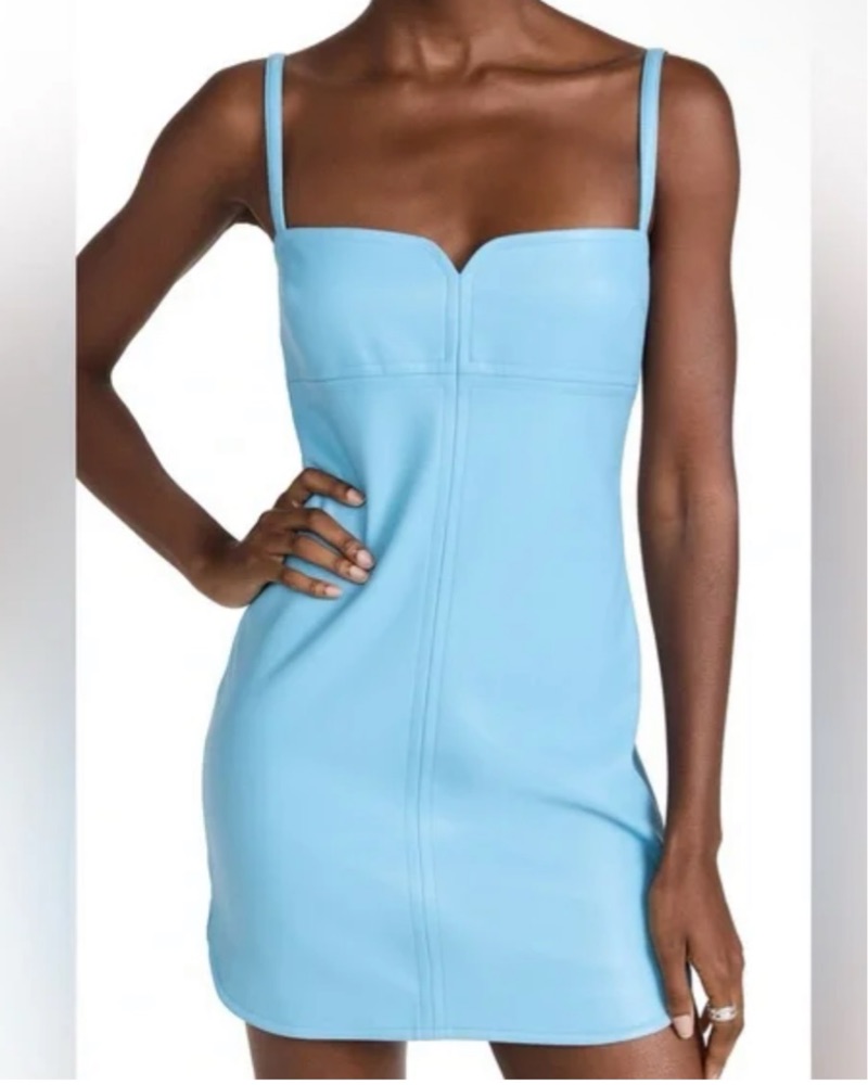 This chic aqua mini dress is perfect for a night out with friends or a special date night. The form-fitting silhouette and sweetheart neckline create a flattering, feminine look. Sorority rush.