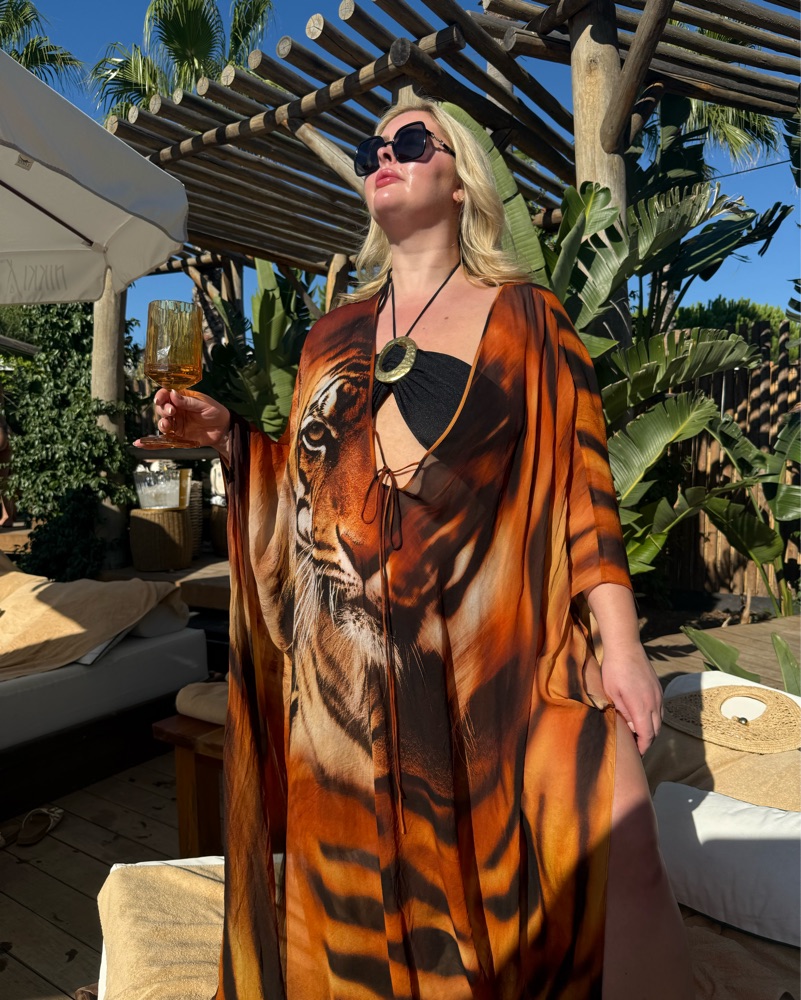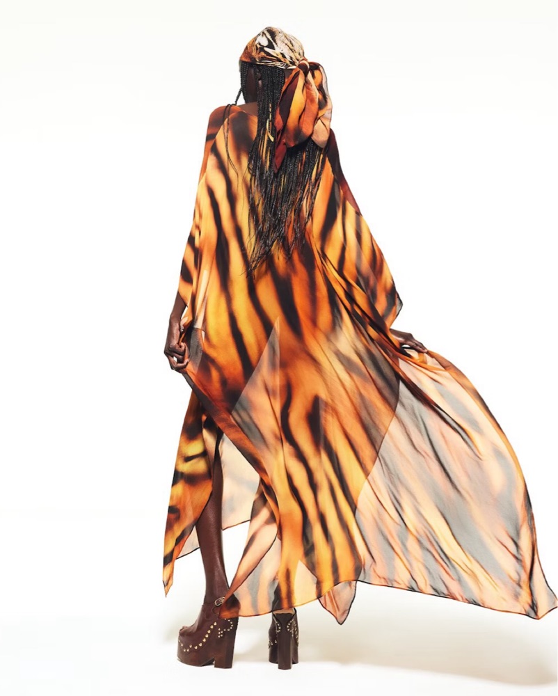 Effortless and elegant. Make a glamorous statement in this floor-length kaftan featuring Roberto Cavalli’s exotic prints. Made in our sheer, drapey viscose fabric, this cover-up comes complete with a deep plunge neckline, thin tie at the center front, and sexy side openings. Excellent condition.