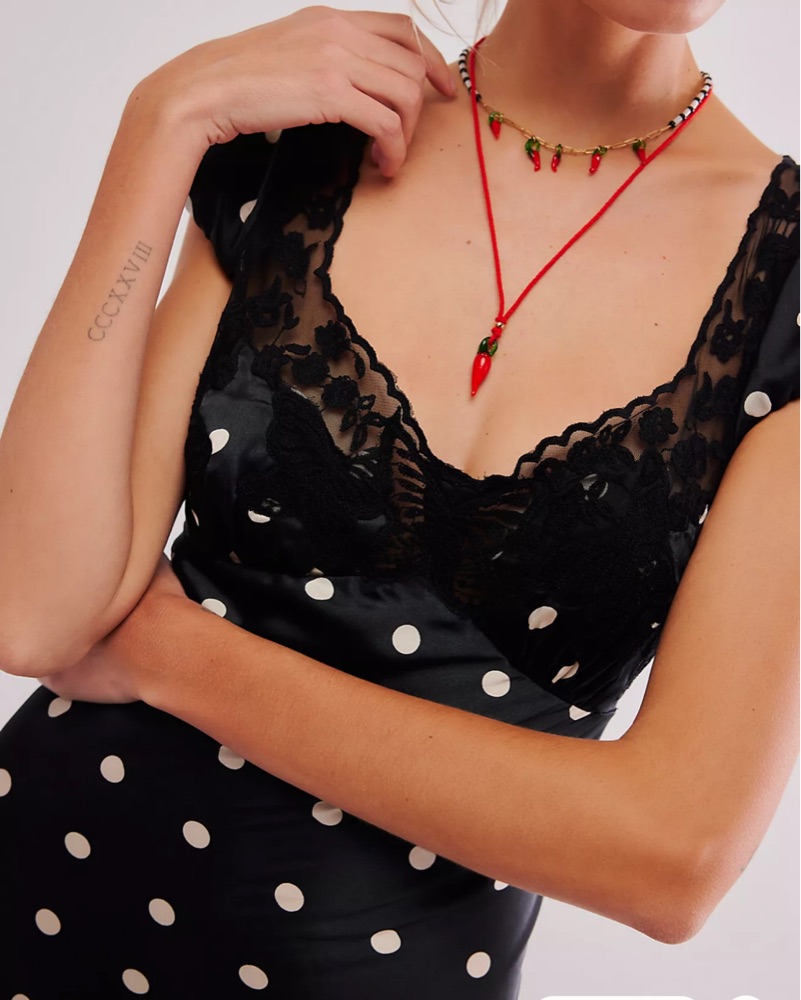 Chic polka dot maxi dress with an open back. Buttons down the back. Perfect for a summer wedding or special occasion.