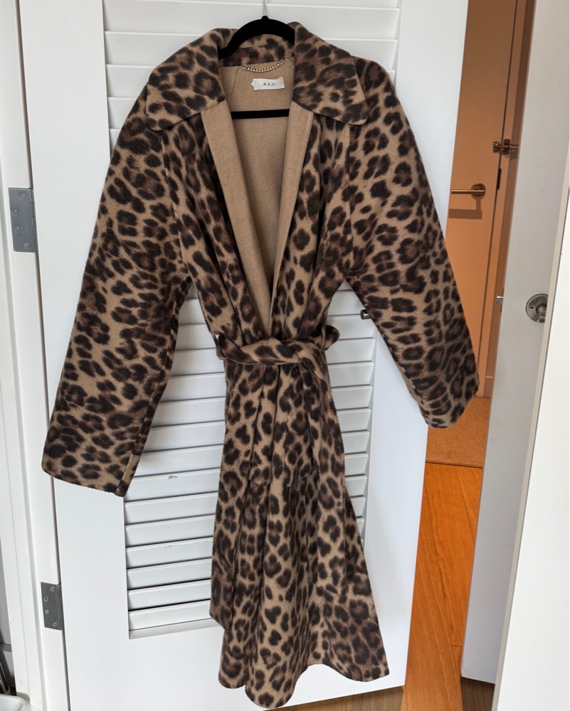 Leopard, Medium, crafted of wool fabric in iconic leopard print. This long wrap silhouette features a point collar with a hook-and-closure, deep front pockets, and a self-tie belted waist.