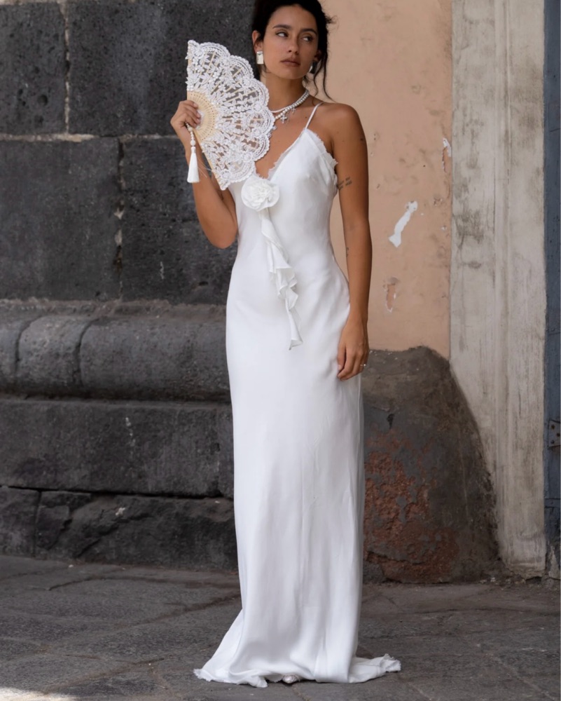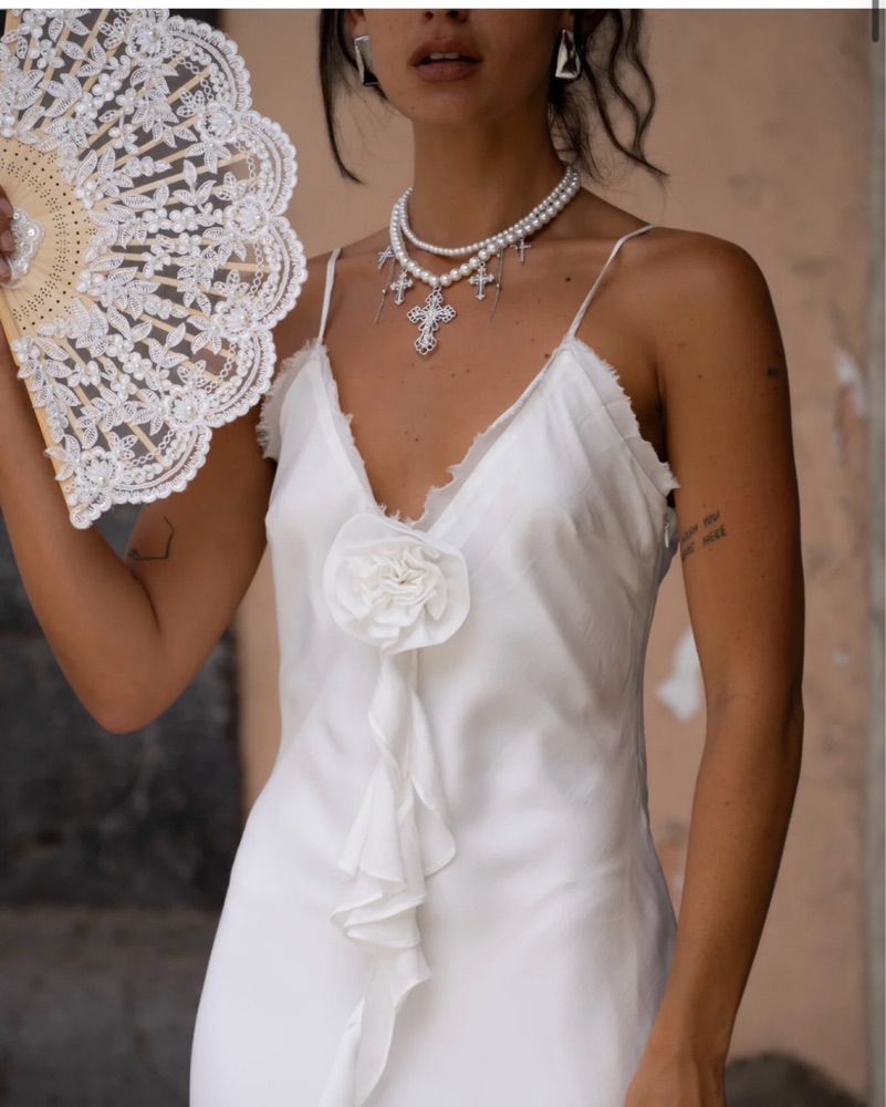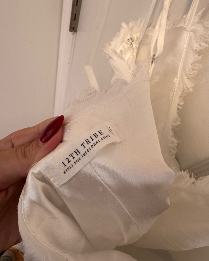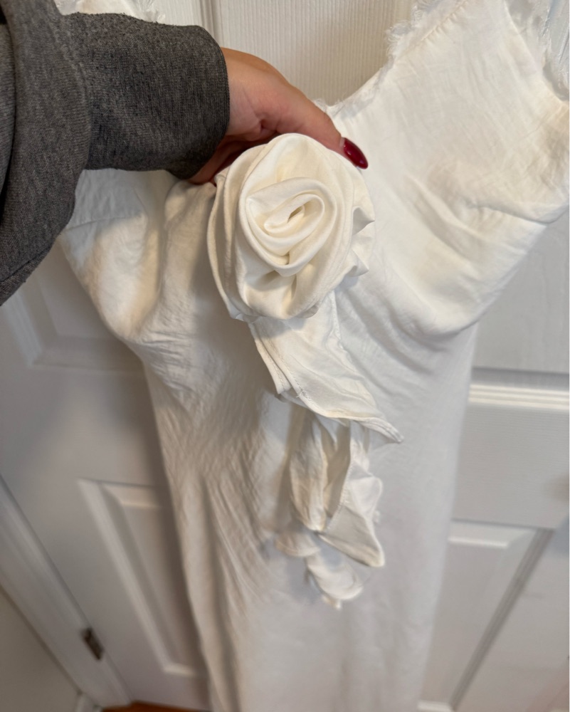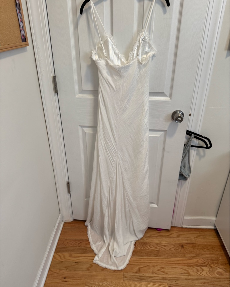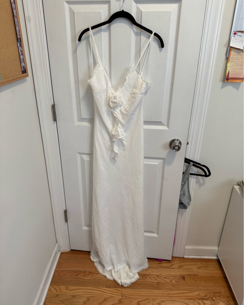 Long white dress, perfect for vacation or wedding events! It’s so flattering. May have a little discoloring at the bottom due to wearing outside, but it has been dry cleaned!