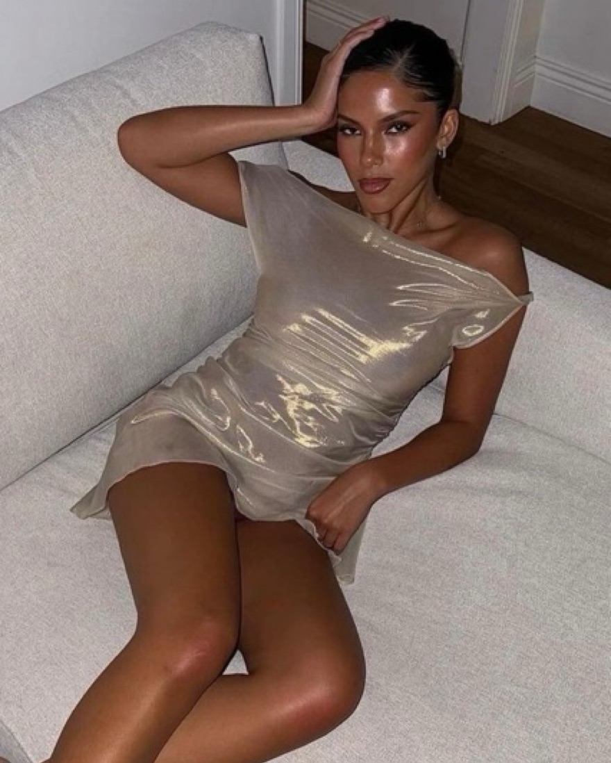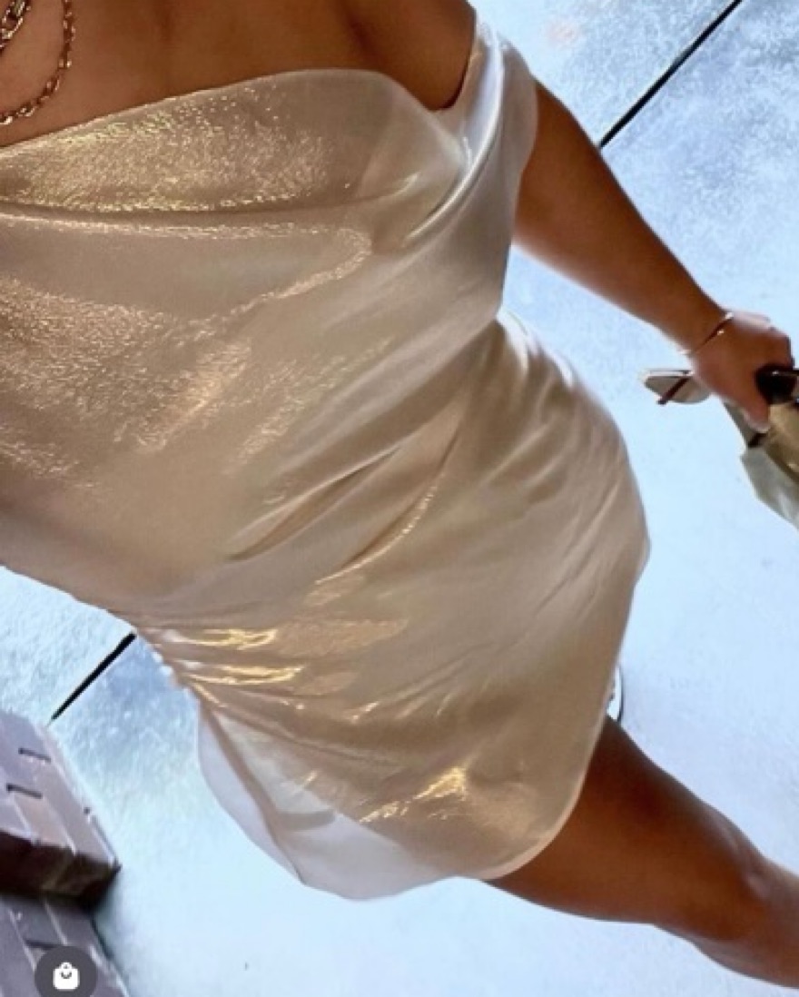 The ultimate bday / party / vacation dress!!! 100% silk — please treat with care. This fabric has a beautiful cream base with gold thread running through it, that is subtle in the shade and shines bright in the sun. It is sheer so would reocmmend sticky boobs and nude undergarments!