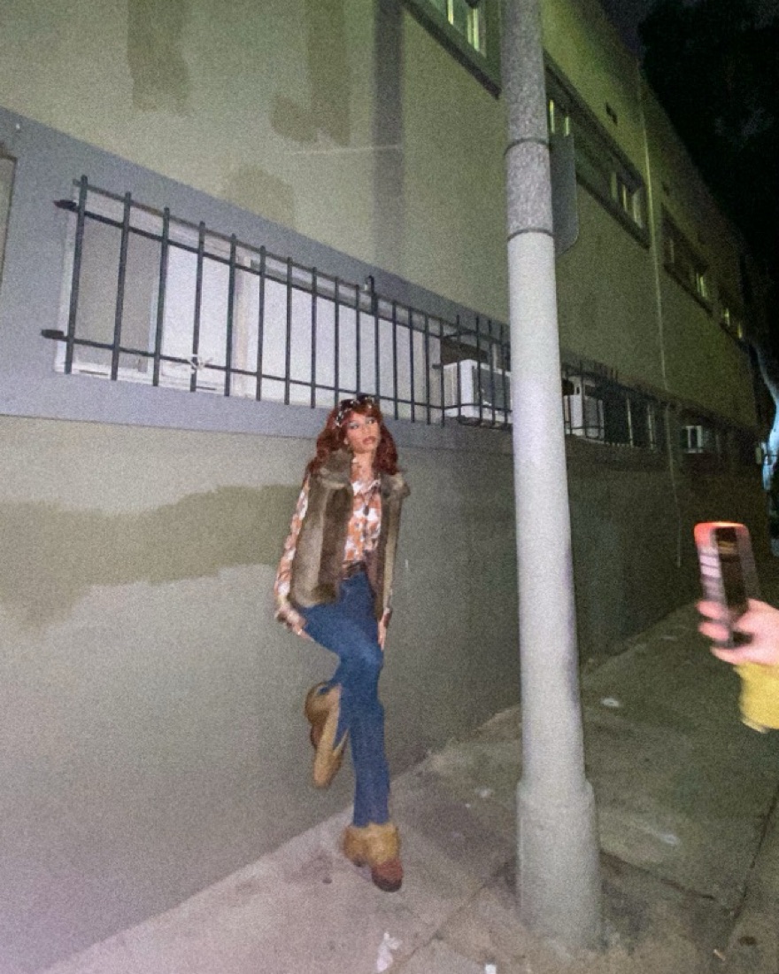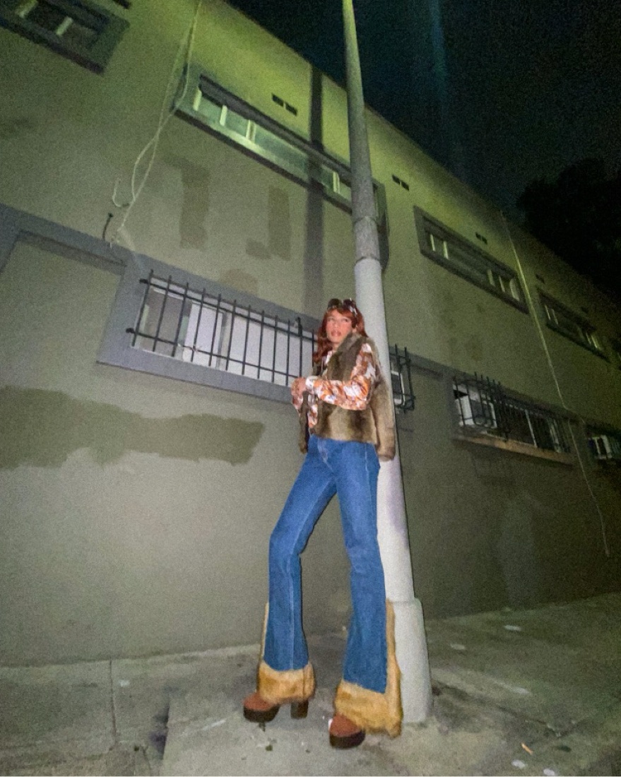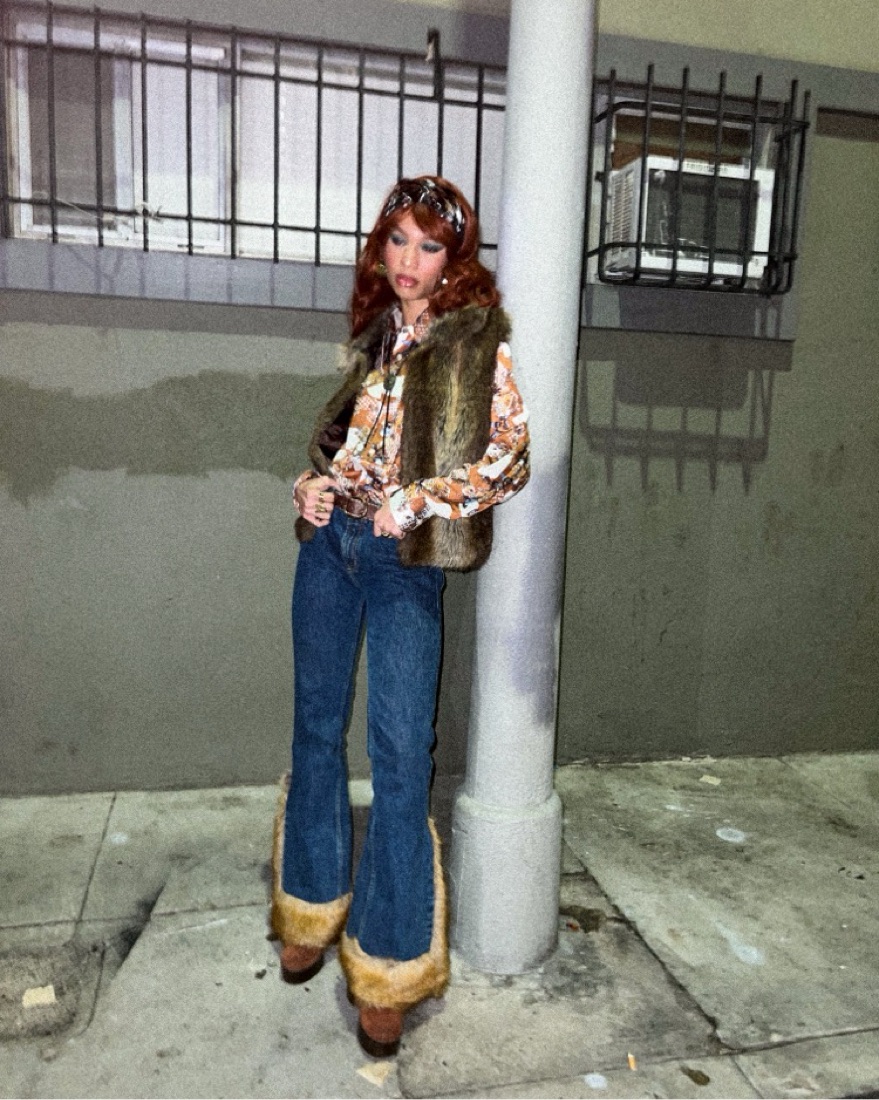 Dark wash denim with faux fur trim at the bottom (the thighs are a bit snug but the waist is a little big on me and im a 27)