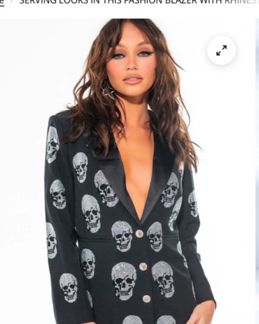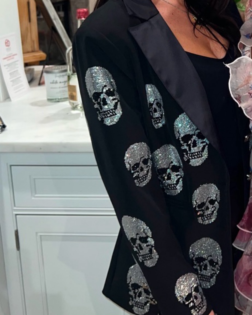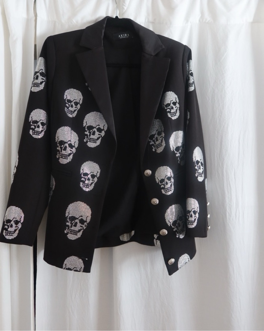 This bold and edgy blazer is perfect for a night out on the town. The all-over skull pattern creates a striking, rock-and-roll inspired look.