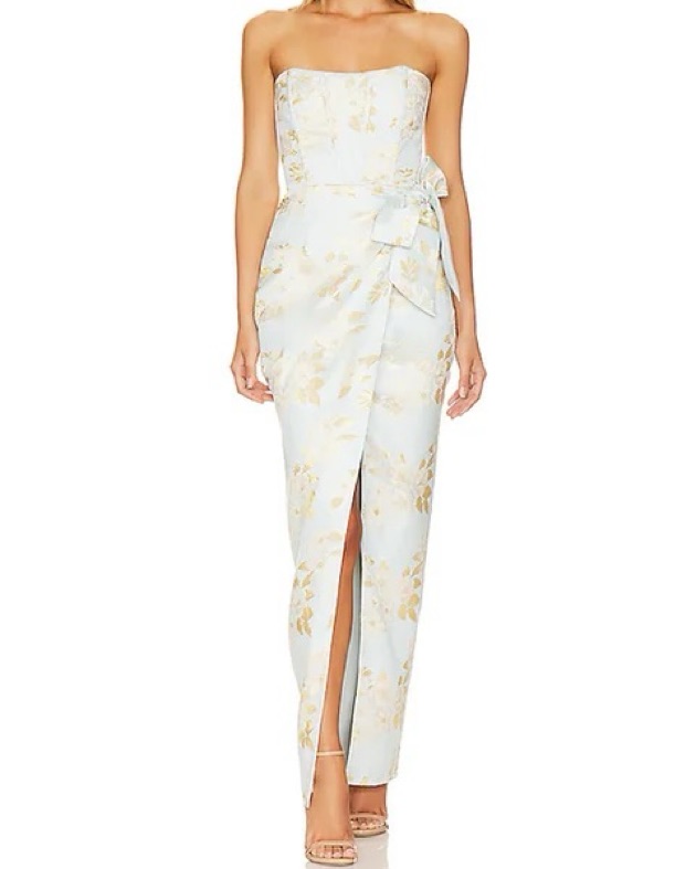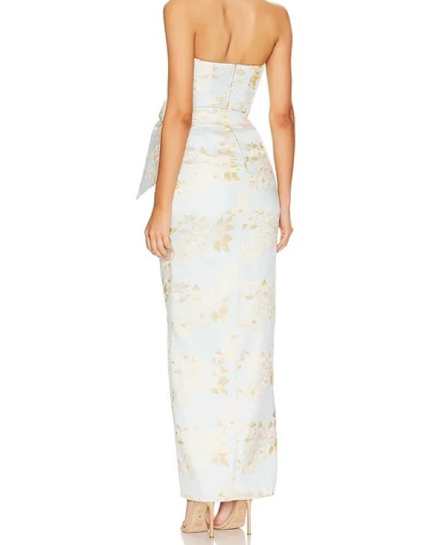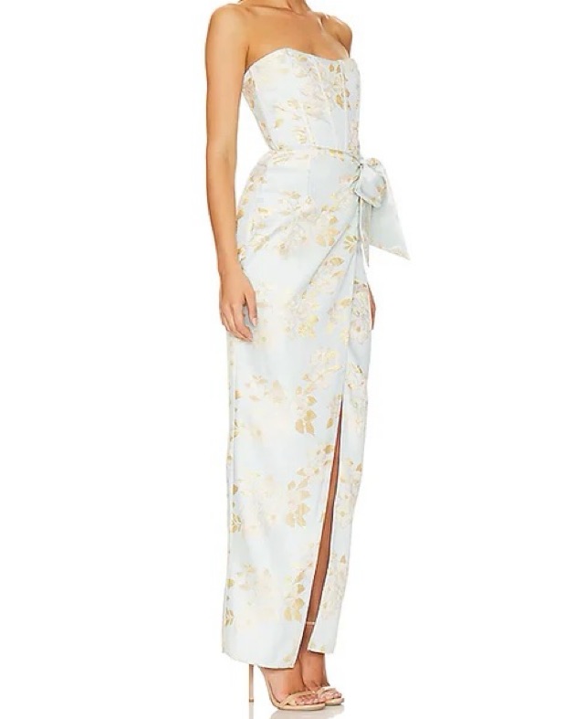 Introducing The June Dress! She's a strapless full-length dress with a beautifully draped wrap skirt, side front slit, and bow detail. She's made from our stunning Ballad Blue Baroque Floral brocade fabric. She's classically sweet, a little bit sexy, and a true blue floral dream! Fits size 4-6.