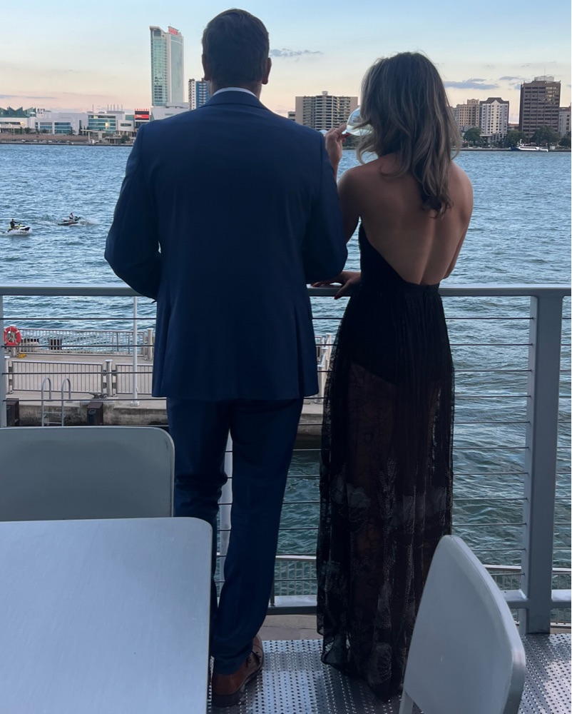 Beautiful black gown by Michael Costello! Sheer and beaded bottom with cut out twist halter top. The bottom isn’t too “cheeky.” Added both stock photos and a photo of myself in this beautiful gown. I’m smaller chested but the top would fit women who are more gifted :) Happy to answer any questions.