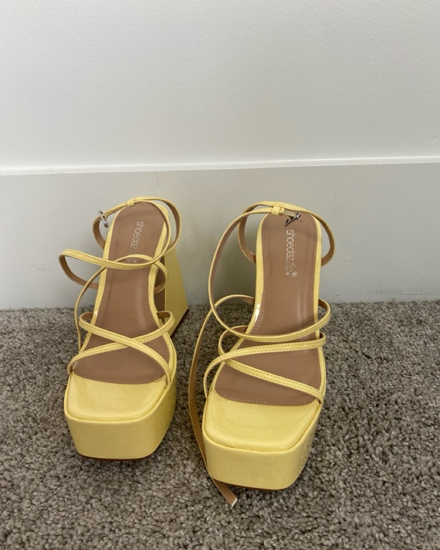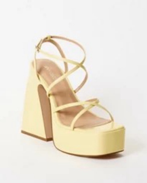 They look more like the color in the shop photo the lighting is just bad in the pics I took :/ super cute chunky pale yellow heels.