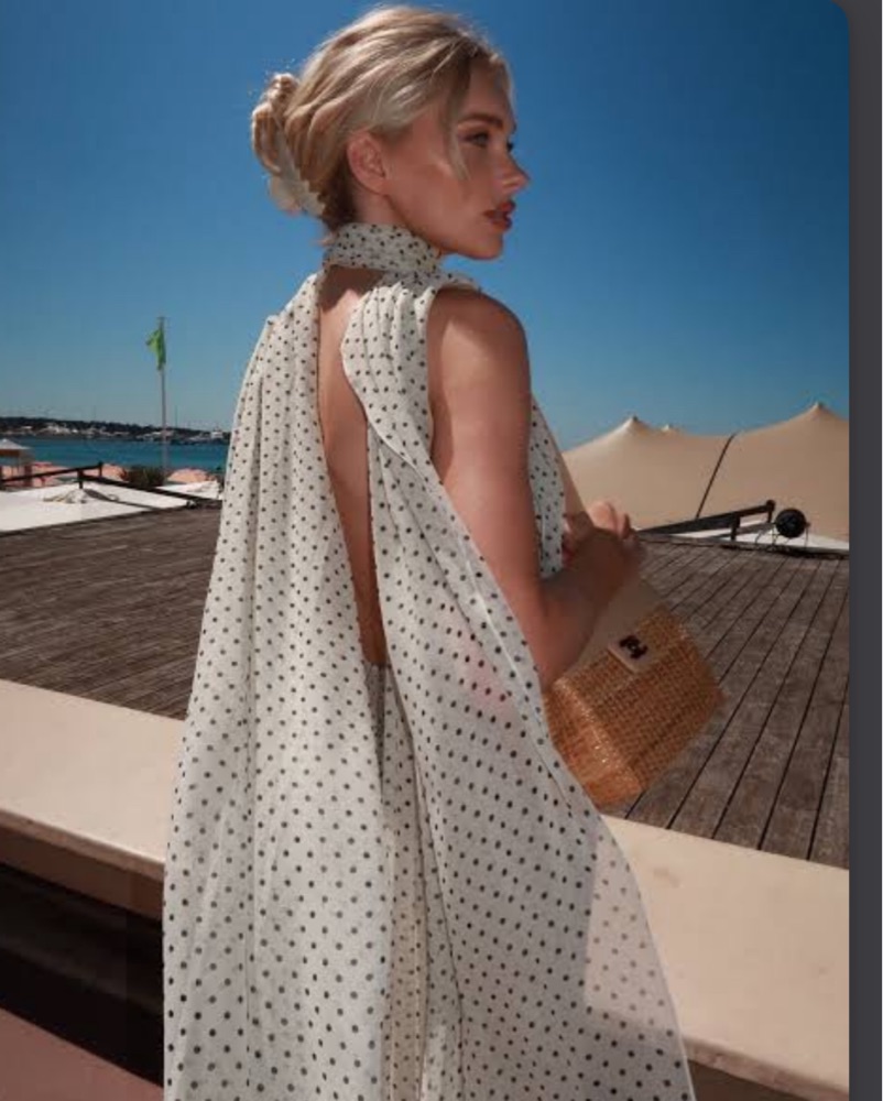 100 % silk with a versatile tie. Dress is a little sheer. Can fit sizes XXS-XS