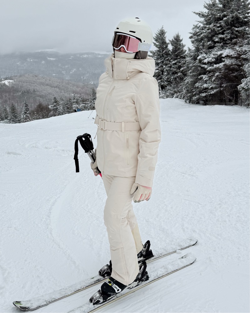 Perfect for skiing or snowboarding, the color is cream or light eggshell. Fits a typical size S-M head