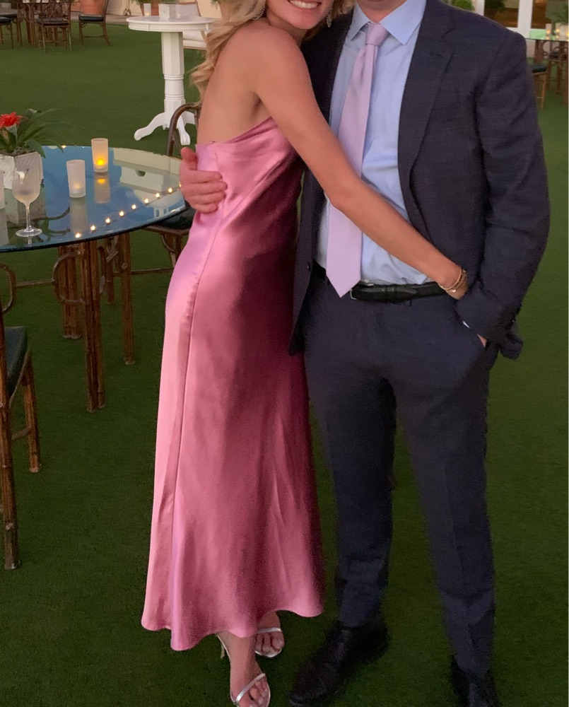 Galvan London light pink silk evening gown, sleeveless with one-shoulder.