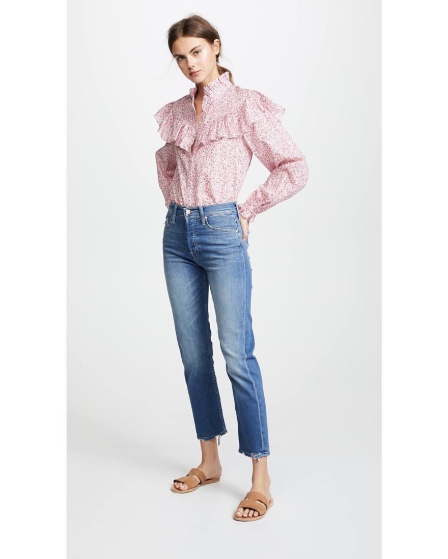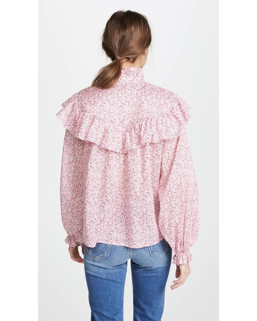 Channeling Victorian flair, this button-down blouse by LoveShackFancy is sweetened with a frilly high-necked collar, voluminous ruffles and pretty floral print.