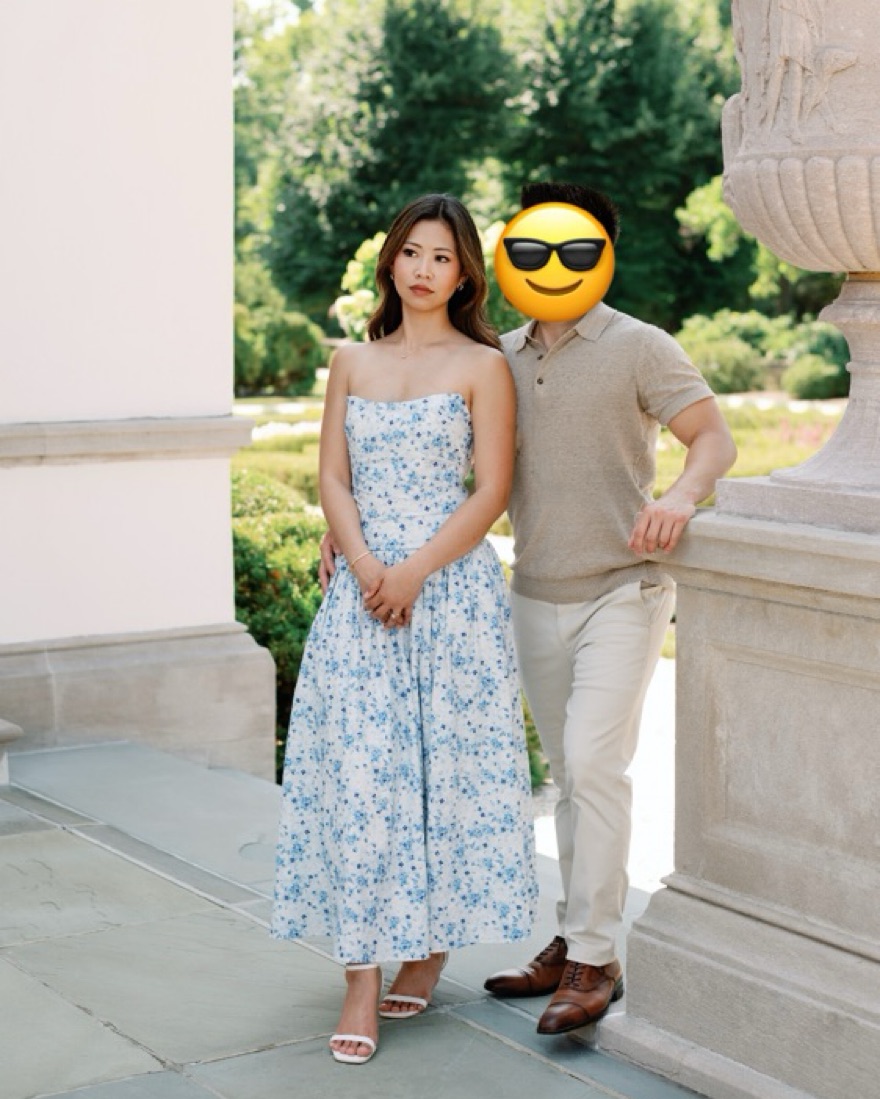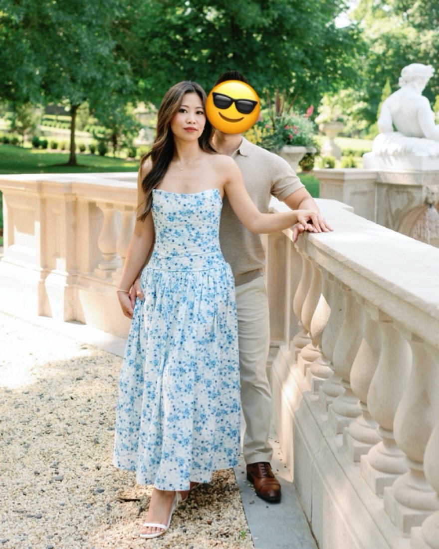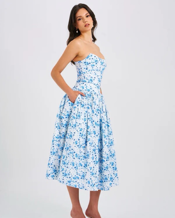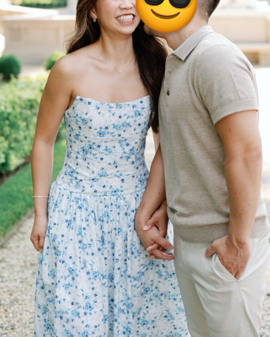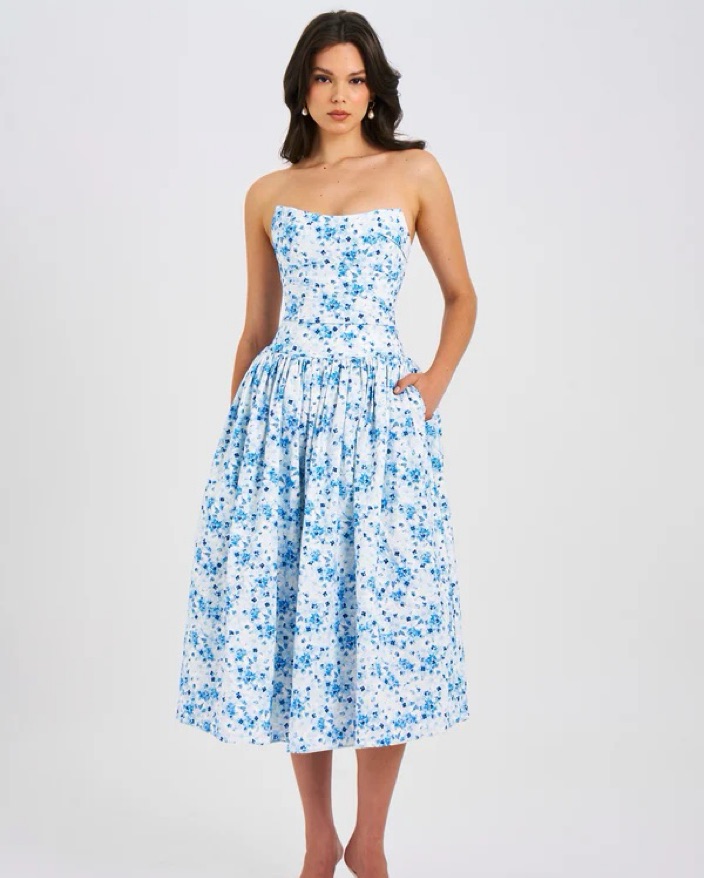 Size S. Blue print linen corset dress. Listed as midi on the website. It’s pretty long on me (5’4”). Dress has no stretch. Perfect for bridal shower, baby shower, etc. I wore it for my engagement pictures.