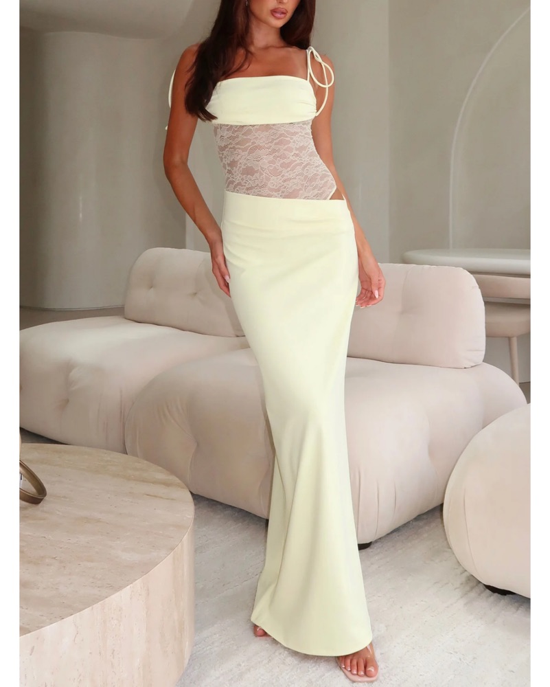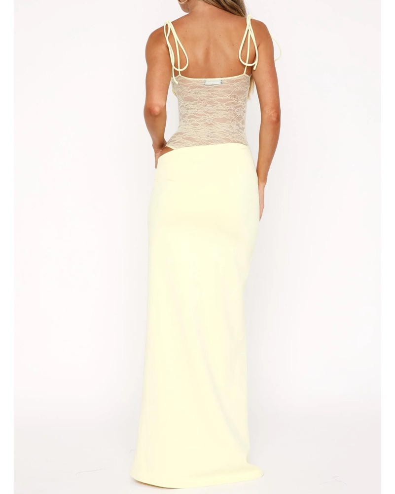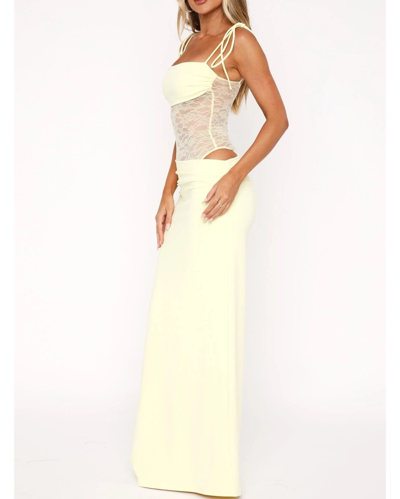 This elegant dress is perfect for any formal occasion. The combination of the lace cutout bodice and sleek maxi skirt creates a sophisticated and alluring look.