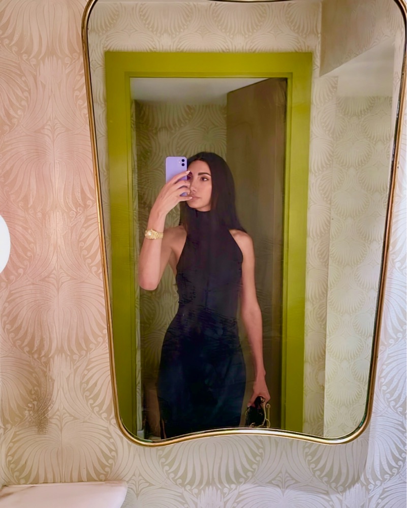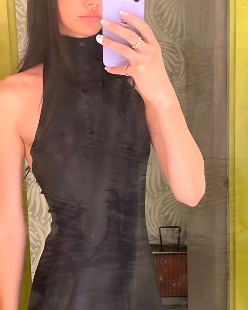 This sleek black halterneck is perfect for a night out or special occasion. The high neckline and form-fitting silhouette create a sophisticated look.