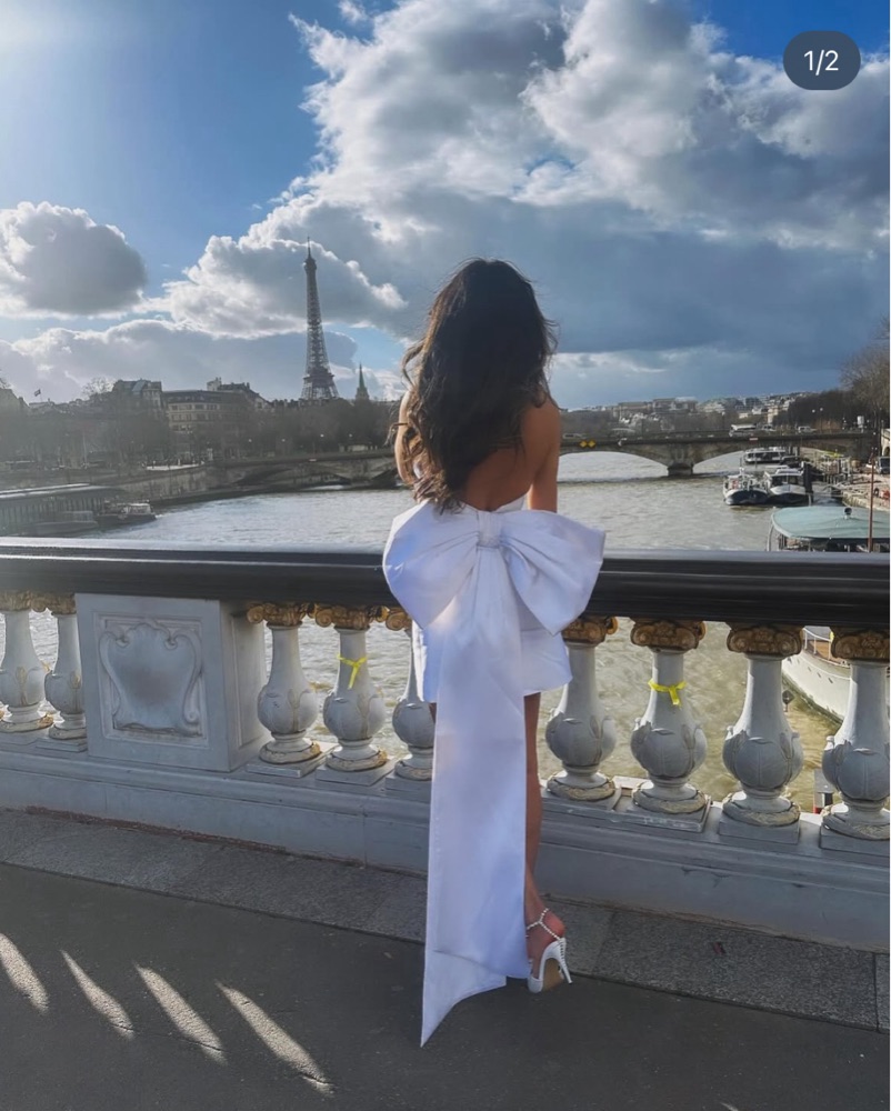 Silk white dress with large bow. Size small. In really good condition and the price is a bit high cause I want to keep the dress