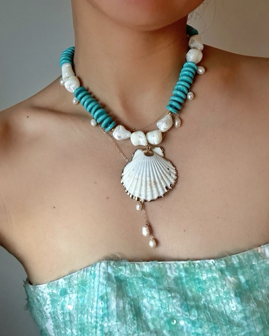 This stunning necklace features a beautiful white seashell pendant accented with turquoise stones. It's the perfect accessory to elevate any beach inspired look.