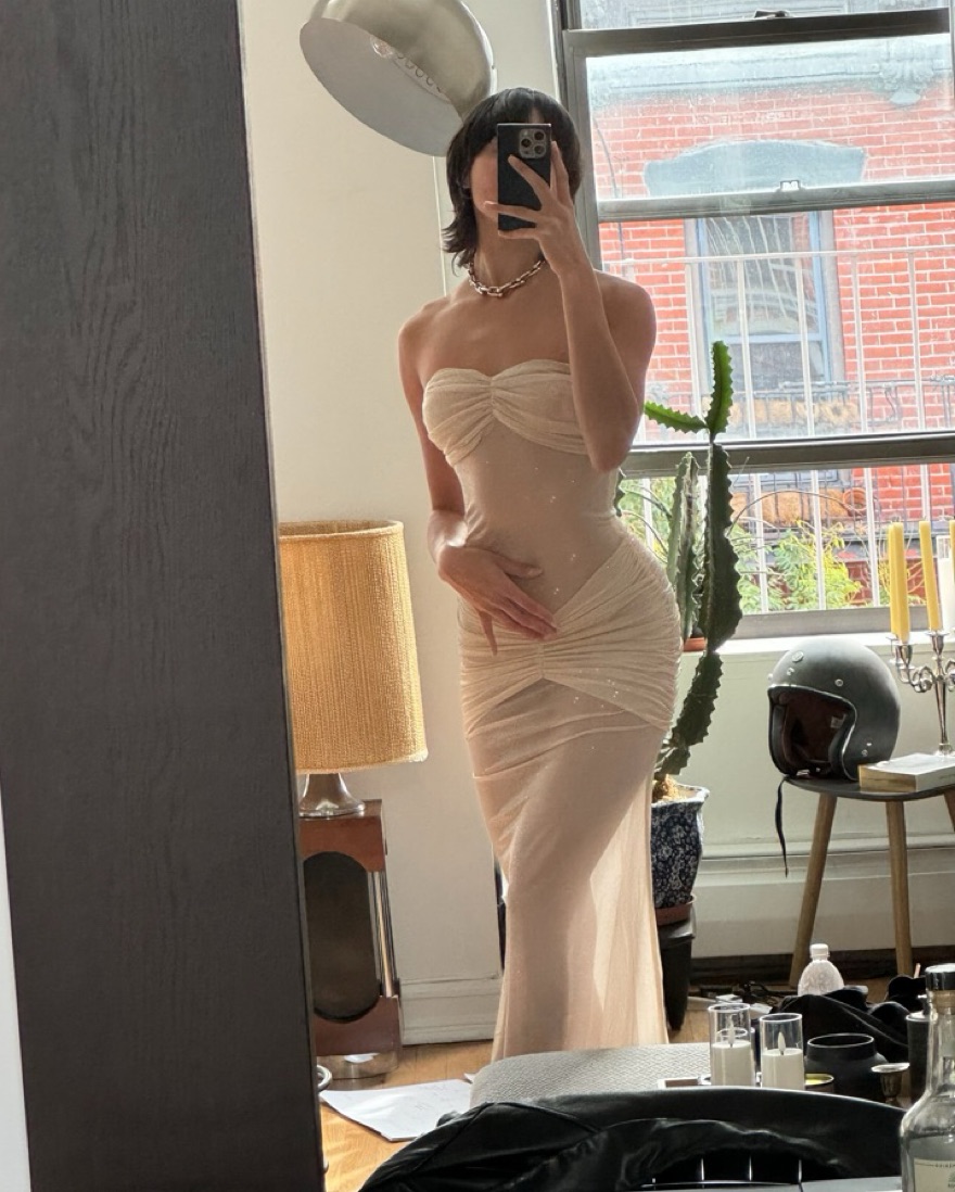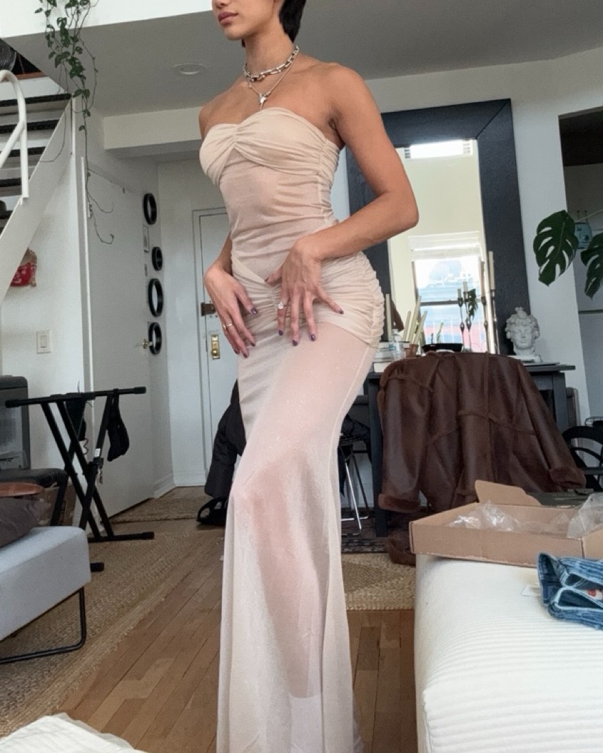 * This is a dupe! Almost too good to be true, as the material feels lovely. A subtle glimmer in dark lighting to absolutely dazzling under bright lights (or with flash 😉). Maybe it IS too good to be true 💖 neck piece not included. (photo taken during the day — way more sparkly in flash)