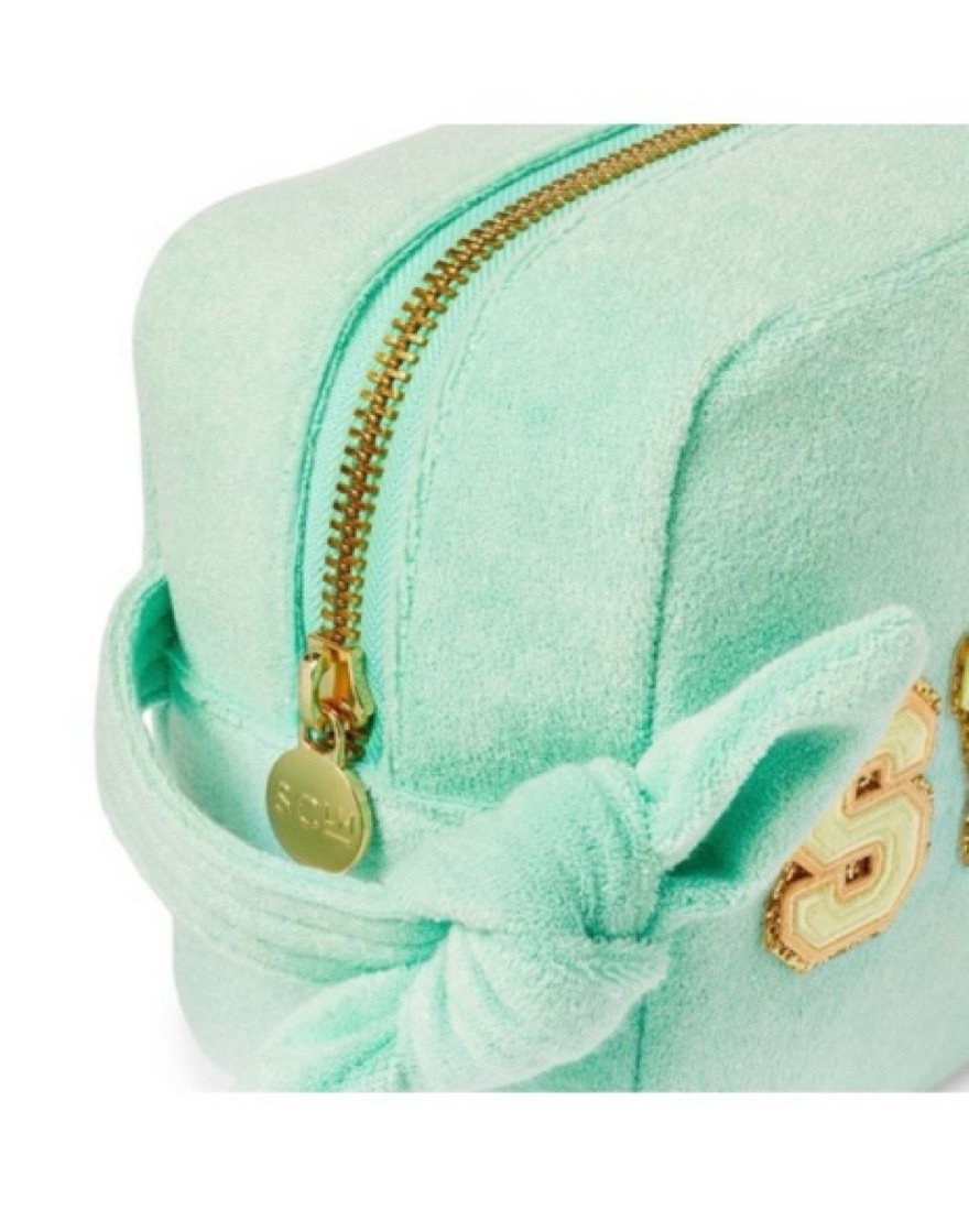 This cozy and stylish makeup or packing bag is perfect for organizing your daily beauty or beach essentials. The soft mint green fabric and chic gold hardware add a touch of glamour to your everyday routine.