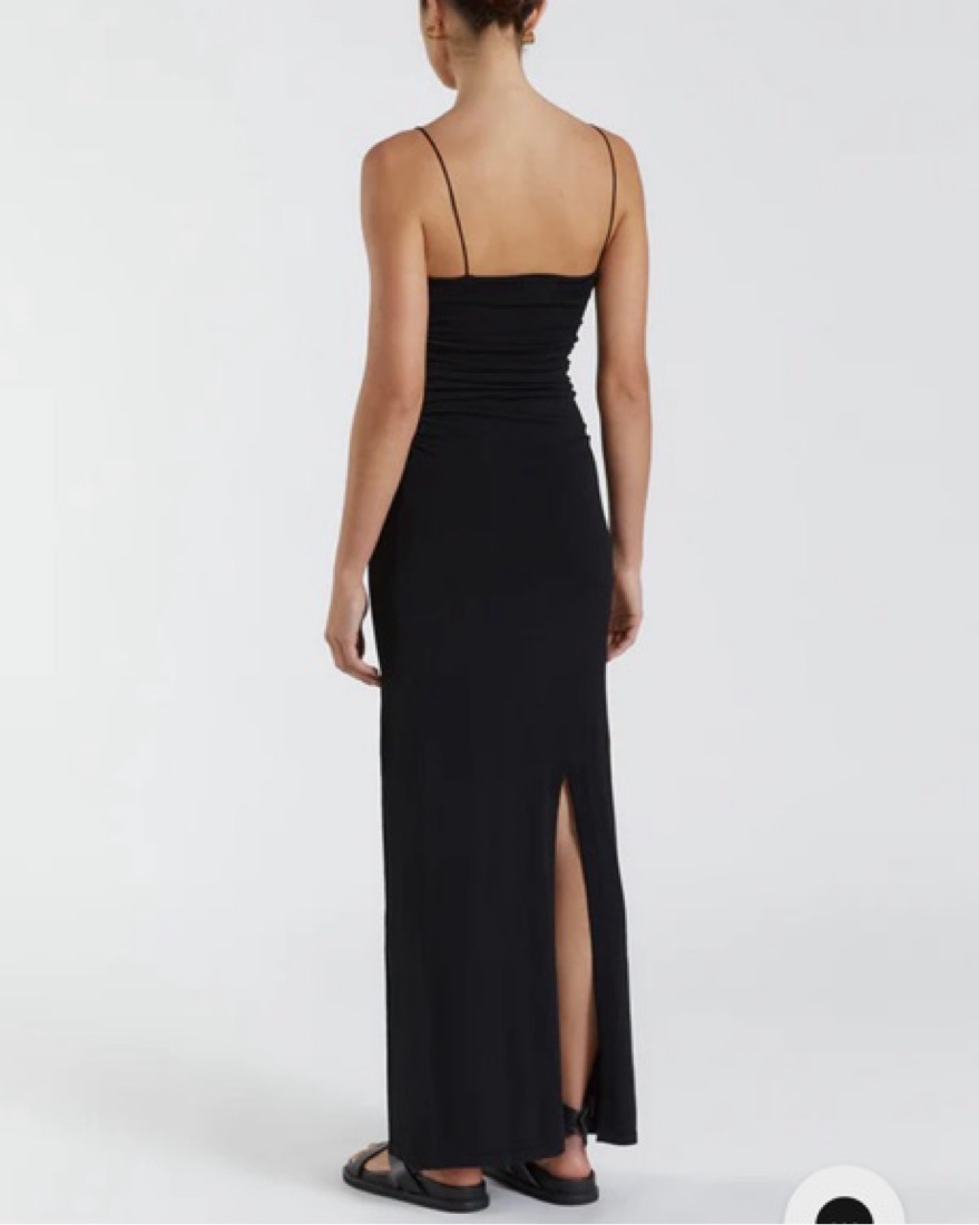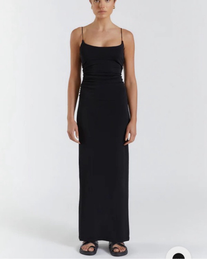 Size M, DISSH black scoop knit maxi dress. Rouching on side so it doesn’t pocket, hugs curves with the stretch material. Thicker material than skims long dress