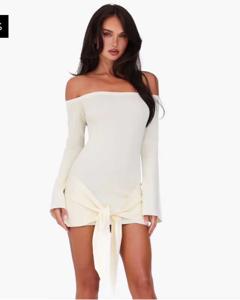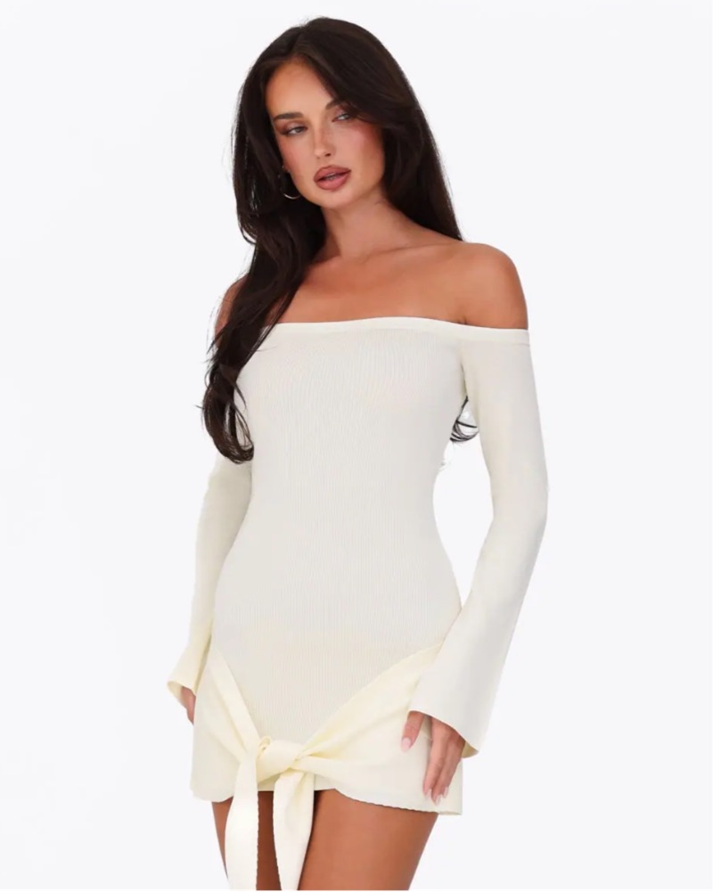 This stylish off-the-shoulder dress is perfect for a night out or special occasion. The tie-front detail adds a playful touch while the long sleeves keep you feeling confident and put-together.