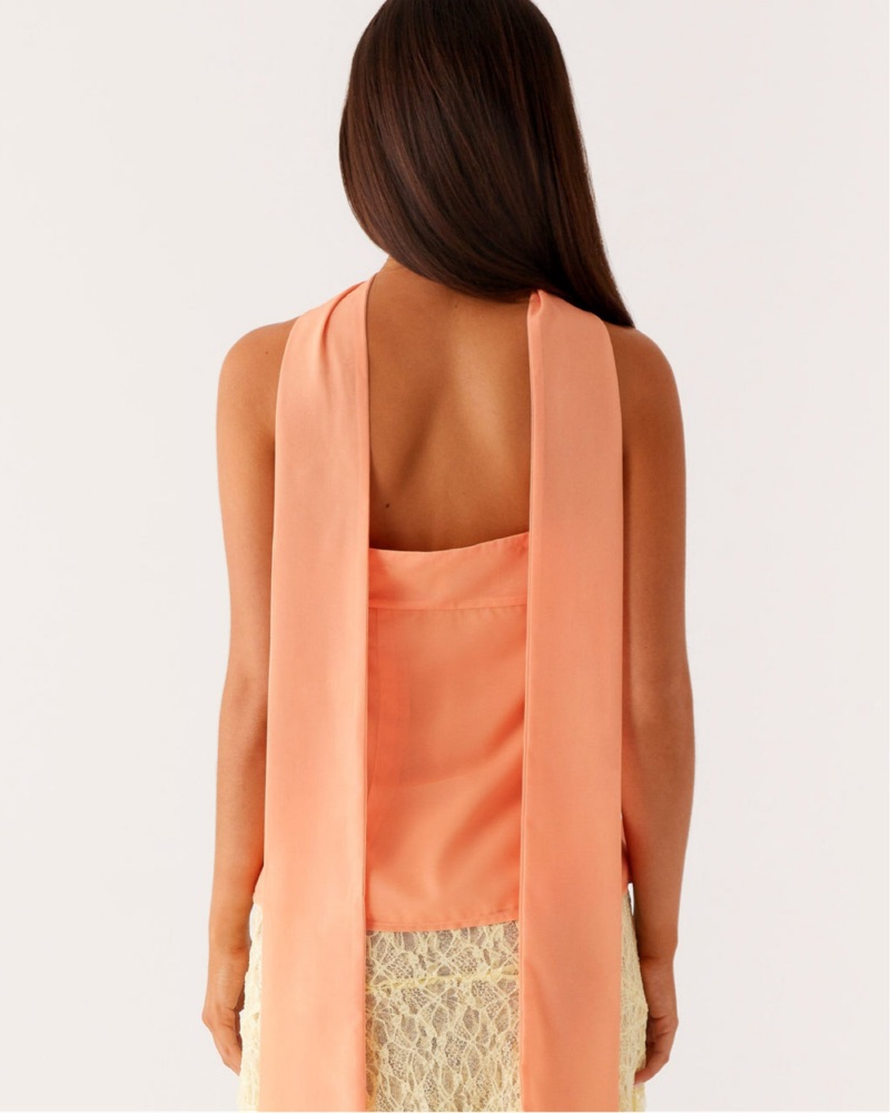 Orange/peach color strapless floral/tropical print with scarf. Scarf is separate so the top can be worn on its own too! Zipper on the side, and grip on the top so it doesn’t slide down.