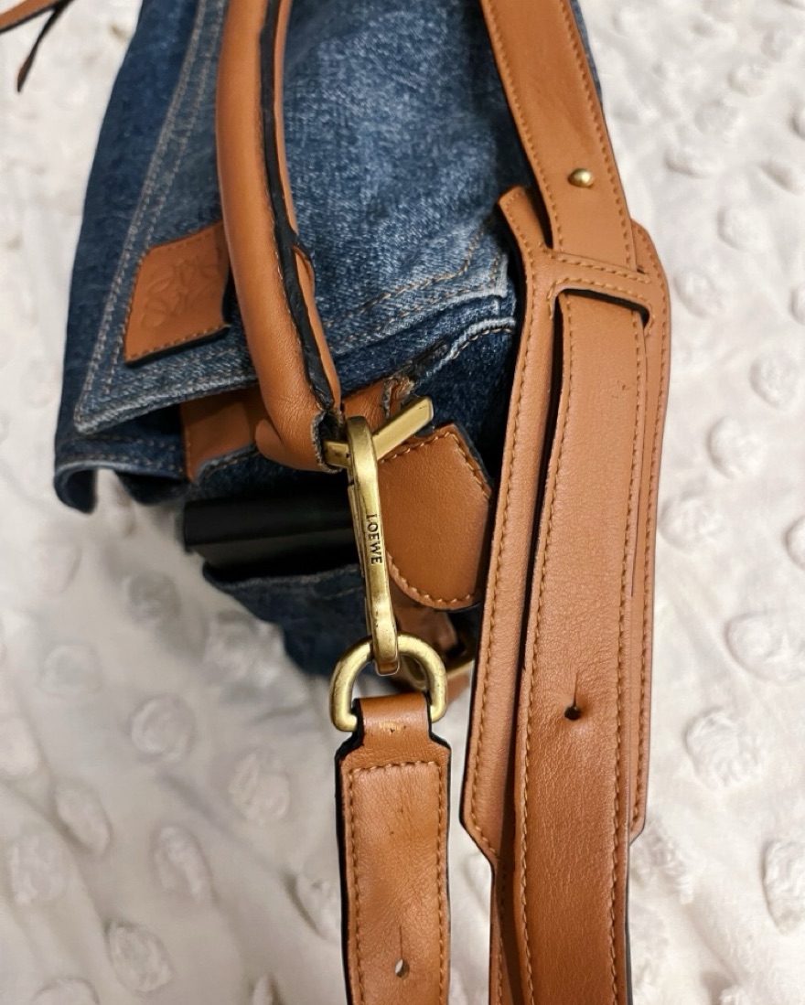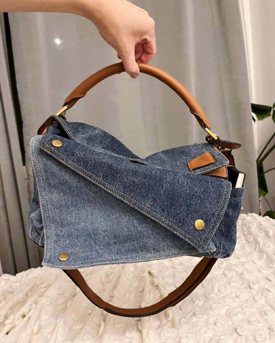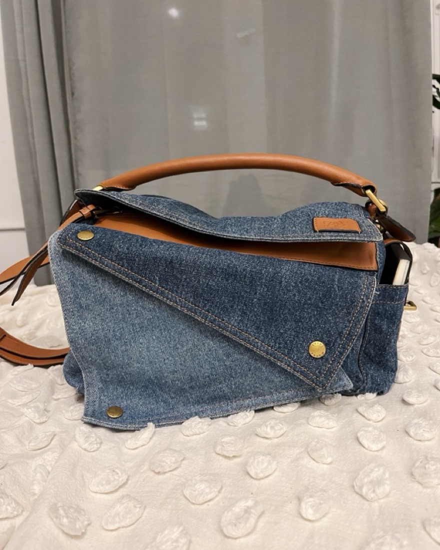 Loewe Medium Puzzle Bag in patchwork denim in various shades of blue and iconic tan color. Medium size means it is suitable to carry all of your daily essentials. This version of the iconic Puzzle bag is so versatile and surefire compliment receiver