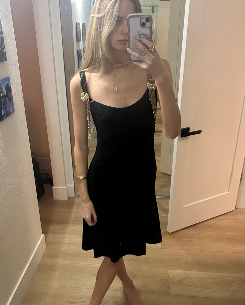 Classic black mini silhouette with a clean, minimal cut and effortless drape.