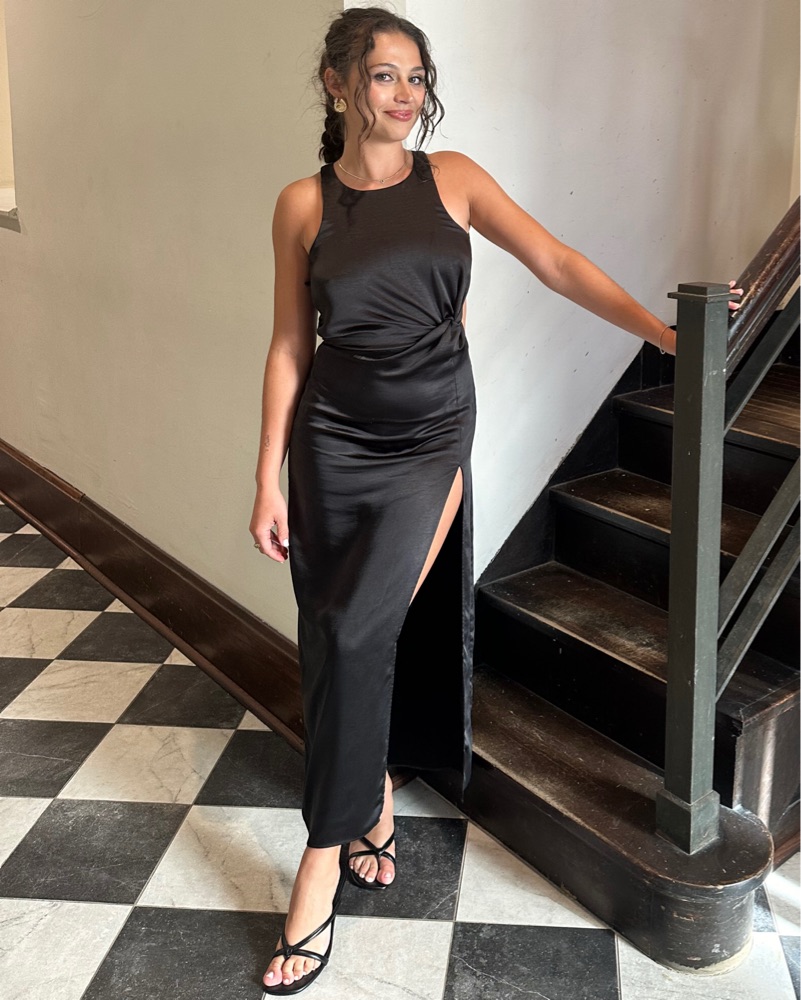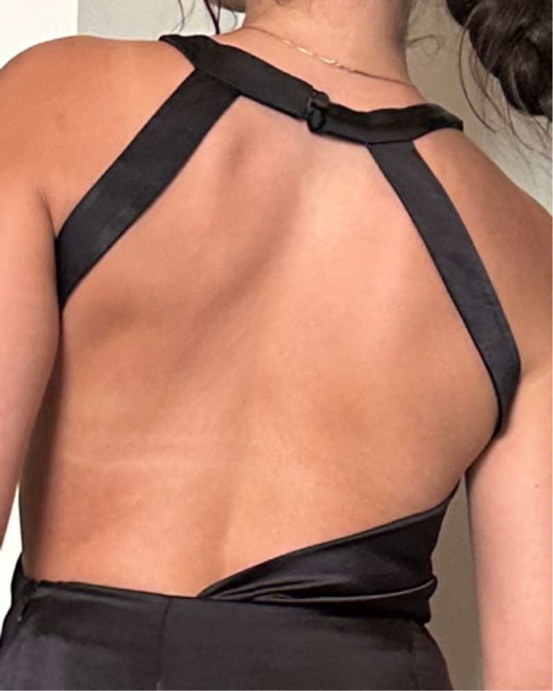 100% polyester. Fits true to size. Zipper on the side and double button on the back (see last pic) Super comfy & great for special occasions! 🖤 please do not wash!