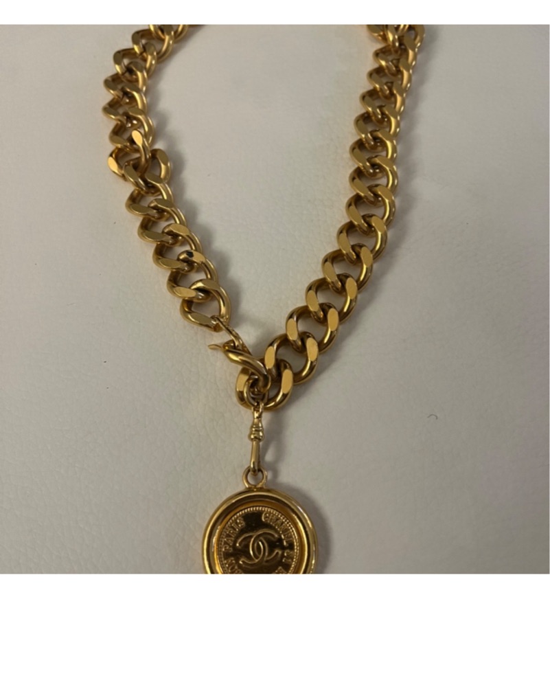 This stylish gold chain necklace with a unique branded pendant is the perfect accessory to elevate any outfit. Wear it to a night out or a special event for a touch of glamour.