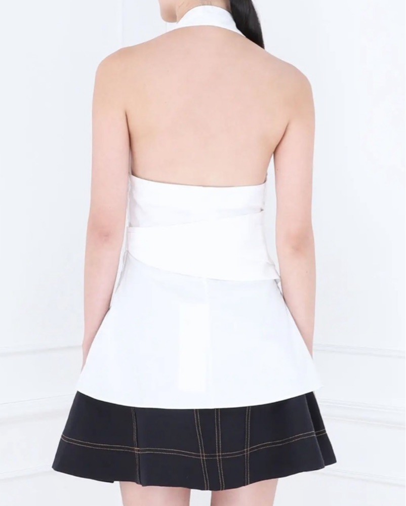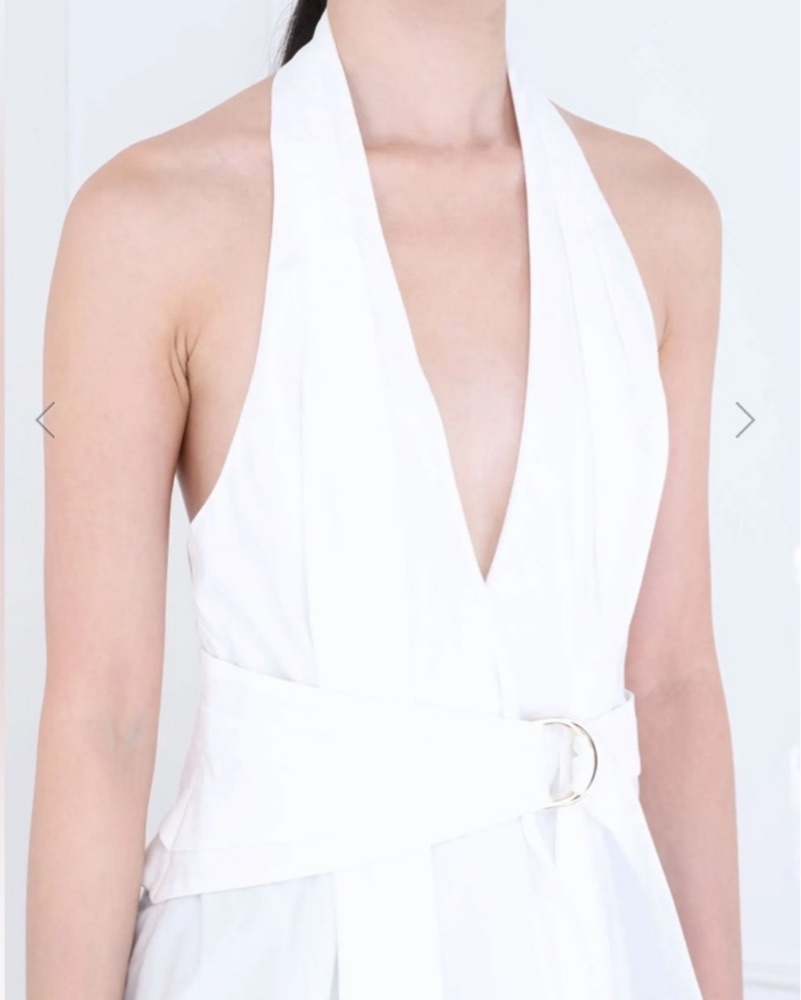 Elegant white halter blouse. Features deep V-neck and belted waist. Perfect for chic occasions.