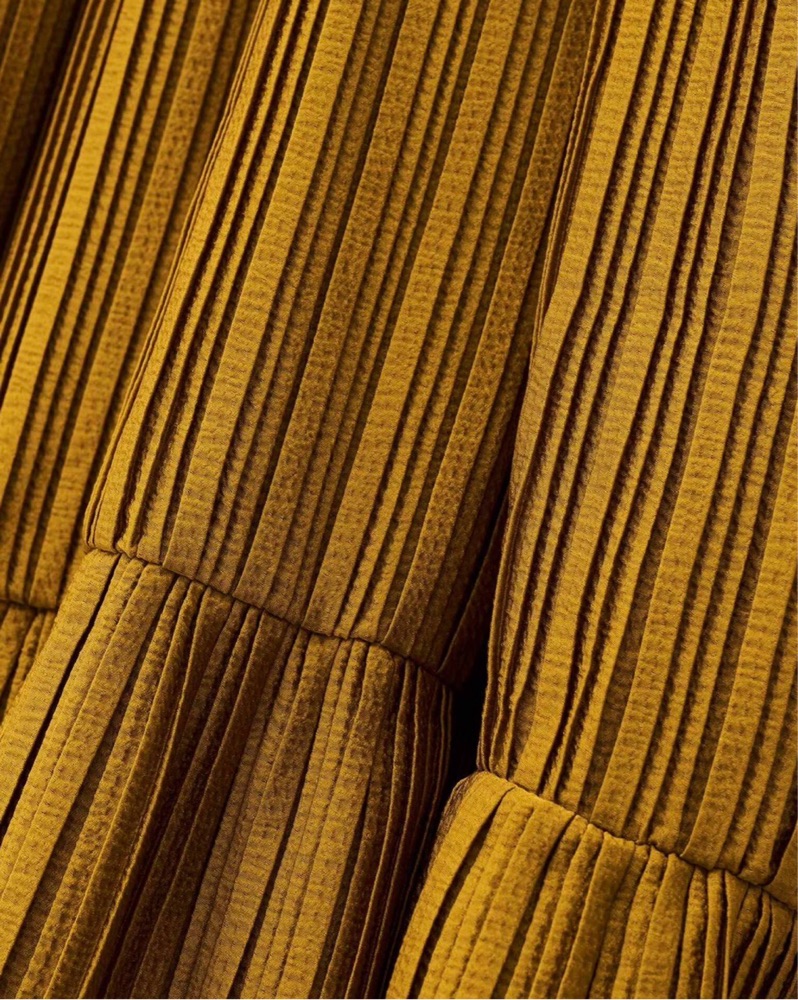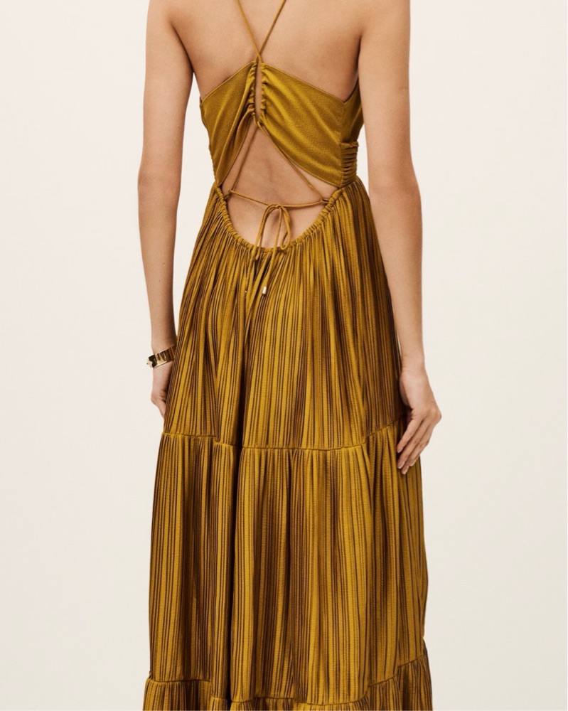 Color: bronze - Maxi dress - Loose-fitting - Pleated skirt - Thin straps - Lace-up closure in the back - Fitted waist