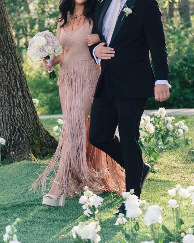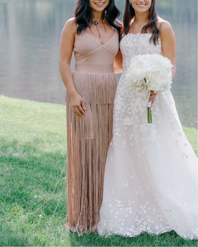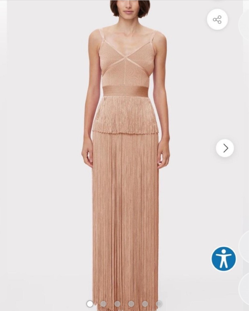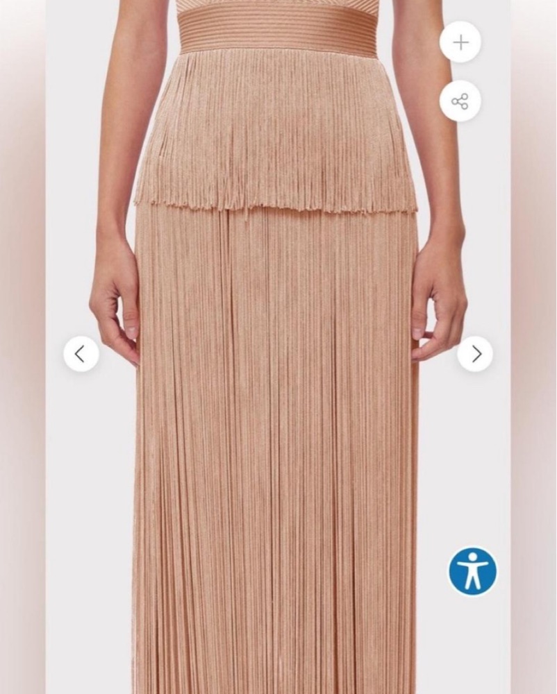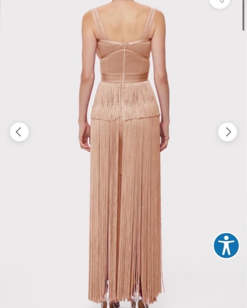 Evening Dress Gown - Metallic Rose Gold. Gorgeous evening gown! Worn once for a wedding. Retails $1890. Very comfortable. Size S - Fits true to size. Excellent condition other than some fringe fray at the bottom of the dress (pictured). #gown #herveleger #fringe #wedding