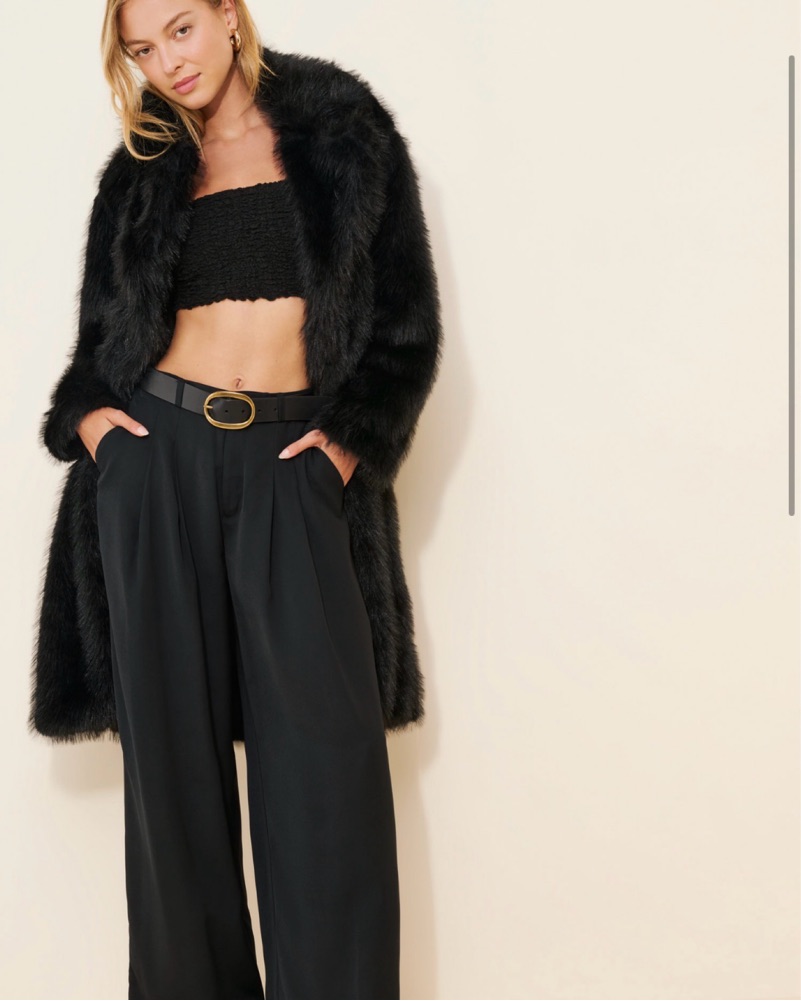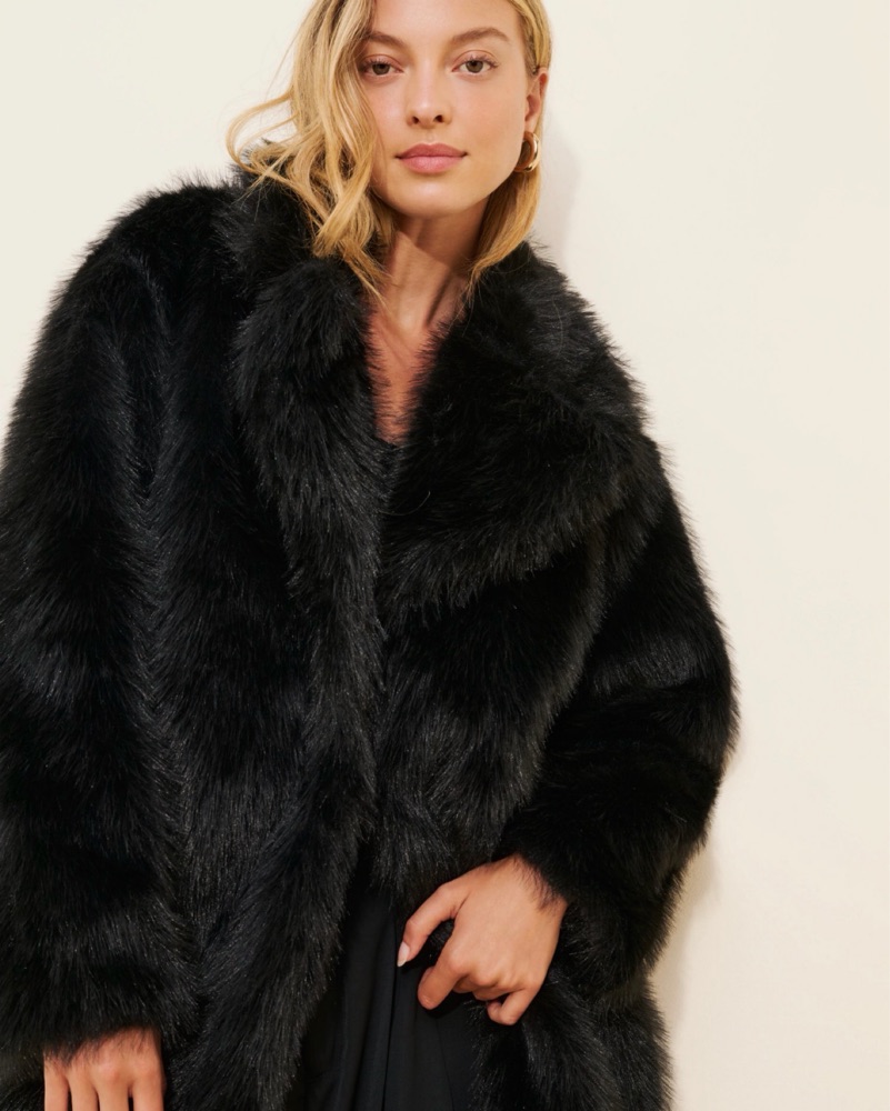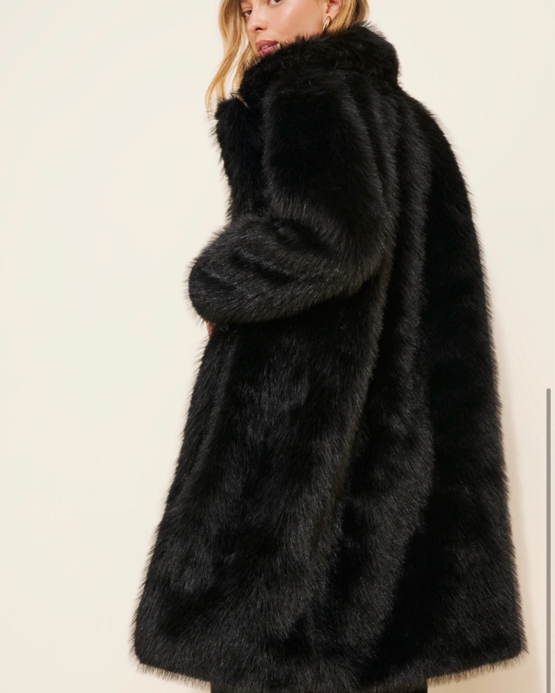 Elevate your winter style with this chic and cozy black faux fur coat. Perfect for adding a touch of glamour to any outfit, from a night out to a special event.
