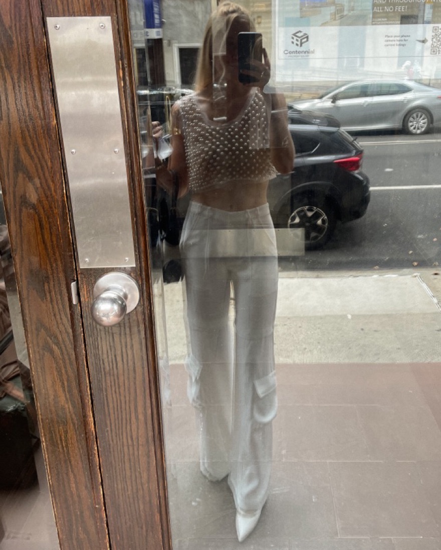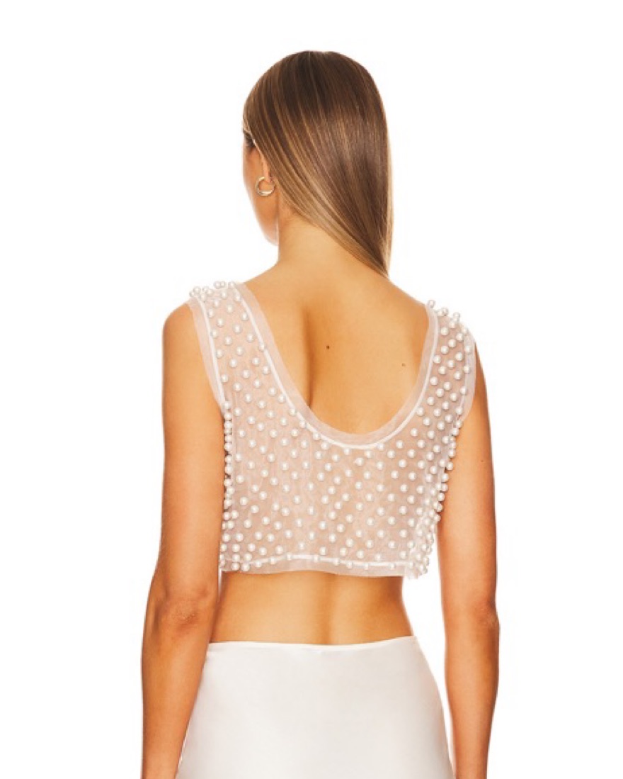 Gorgeous LoveShackFancy top made of pearls and mesh-like lace. It is sheer and looks so cool with pasties and also can go for a nude bandeau look. Wore once to a Hamptons All White party. Definitely a statement piece. Originally $395.