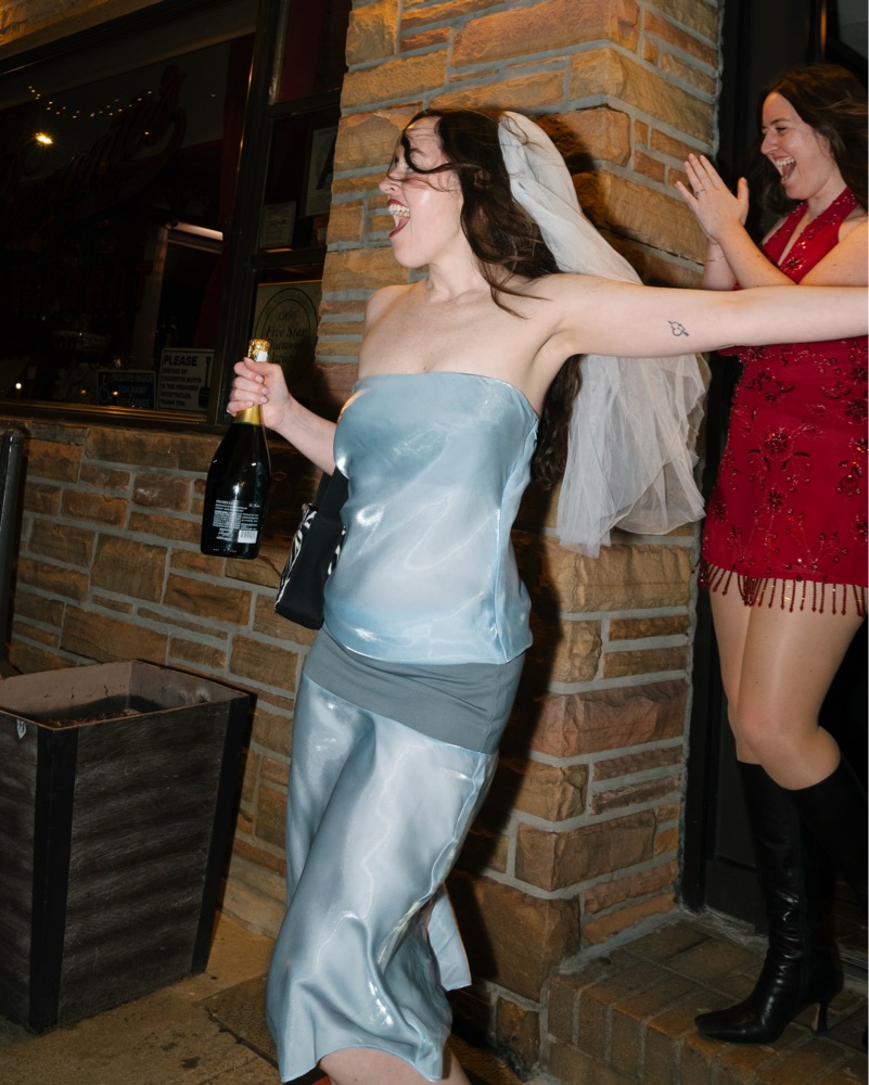 The Melt Panel Dress is a 90s inspired statement dress in a special liquid-appearing light blue fabric. Bias cut, midi length, with a comfortable stretch knit panel that lets you customise how it sits over your hips. Built-in bralette crafted and side zipper.