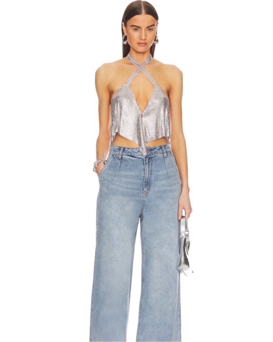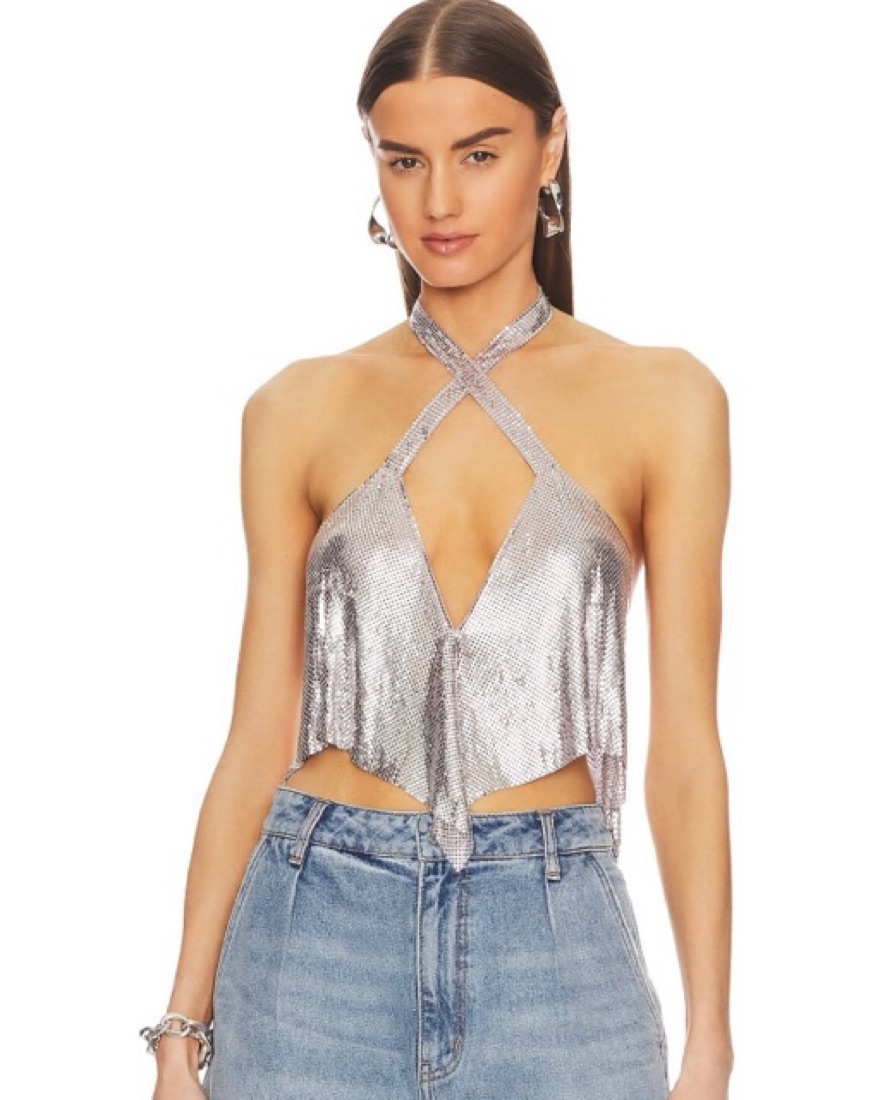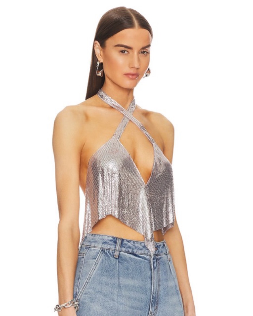 Metal Shiny Top with crisscross neckline and snap closure in back