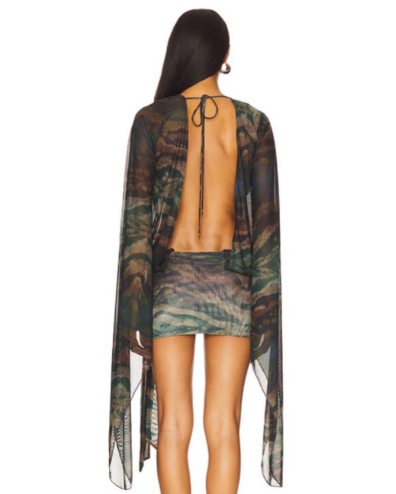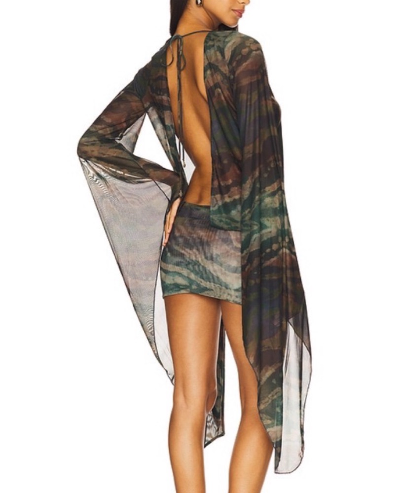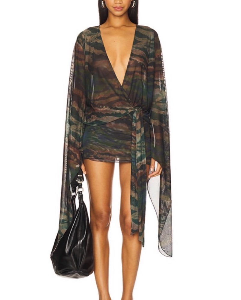 Jaded London low neck wrap dress with open back, green/brown animal print. I had the sleeves on mine hemmed so it stops around the wrist because the super long sleeves were annoying.