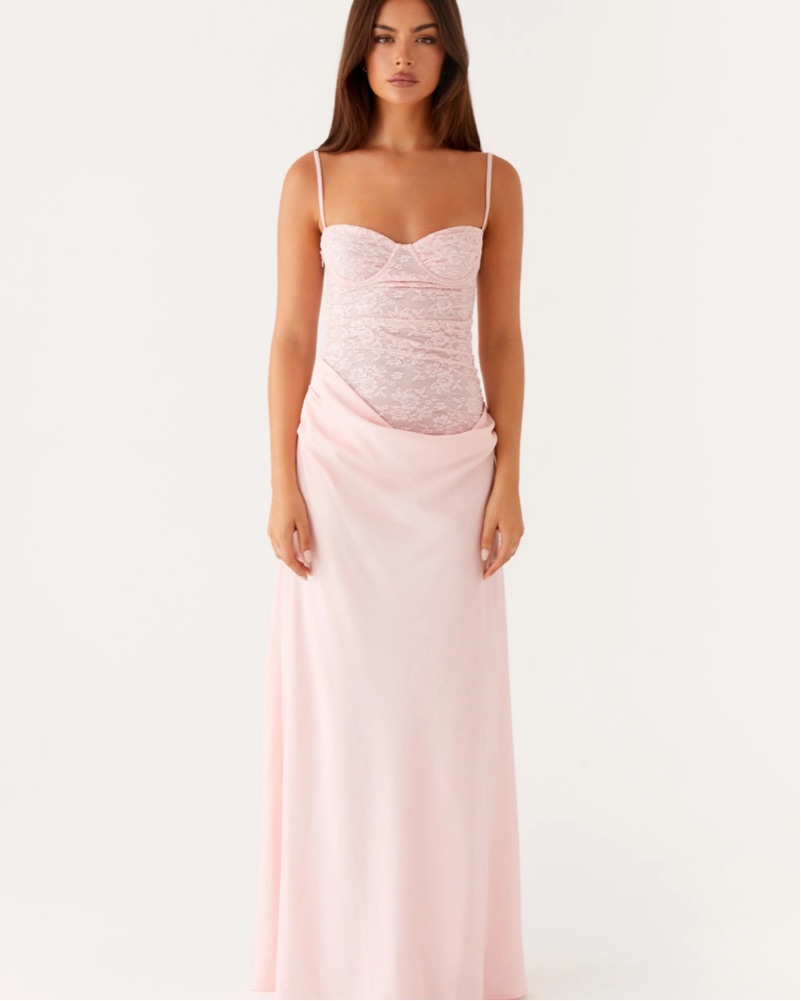 The Romy Maxi Dress is a stunning and structured piece, featuring underwired support for a flattering fit and gathered skirt detailing that adds texture and movement.
