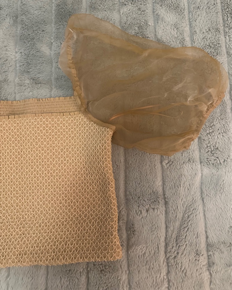 Elegant beige stretch-knit top with puffy mesh sleeves by ASTR the Label. Features unique textures.
