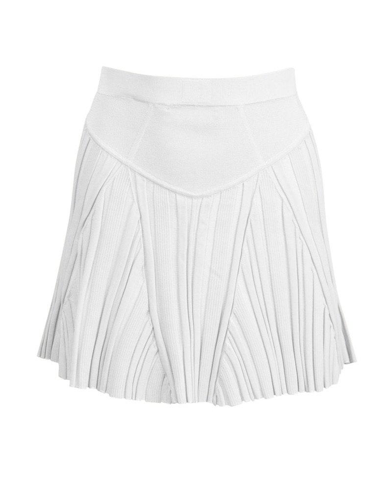 This stunning white knit skirt is perfect for any formal occasion, from weddings to cocktail parties. The structured silhouette and feminine pleats create a sophisticated and chic look.