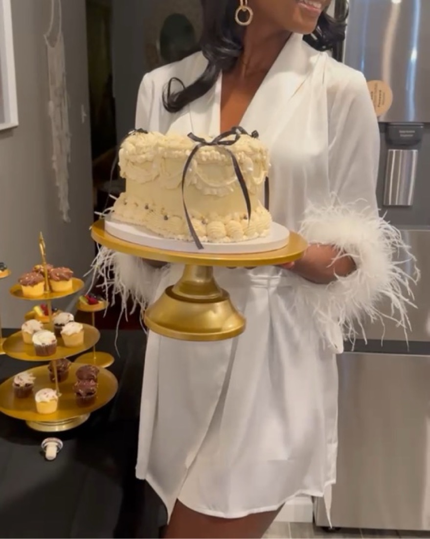 A chic faux- feather trimmed robe from ANTHROPOLOGIE , perfect for an elegant night or wedding photo shoots