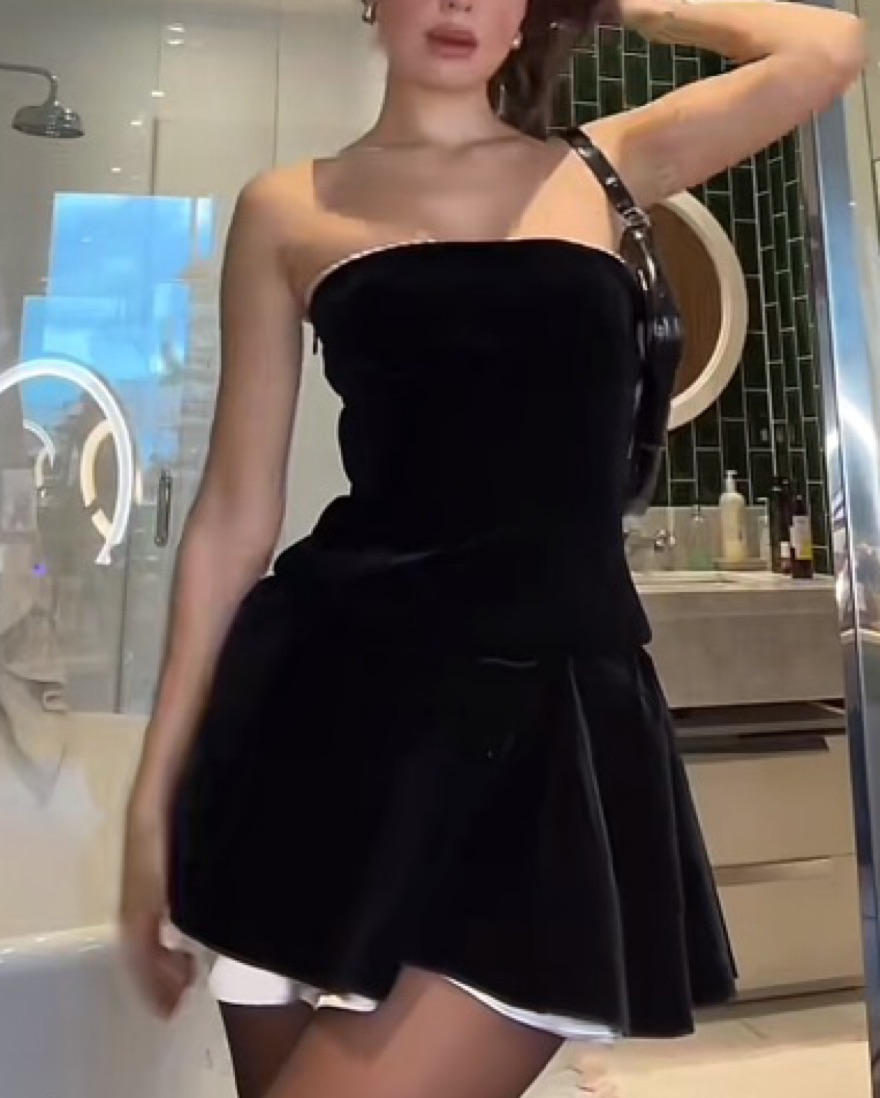 Fits XXS/XS. Made from plush stretch velvet, it has a strapless, corseted bodice that laces up at the back to cinch your waist and is beautifully trimmed with soft satin along the neckline and peaks below the hem. The gathered skirt is ultra flattering and it zips to the side for easy on.
