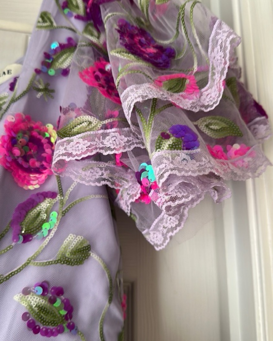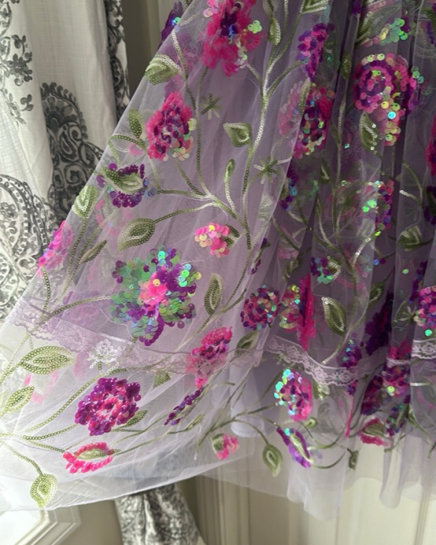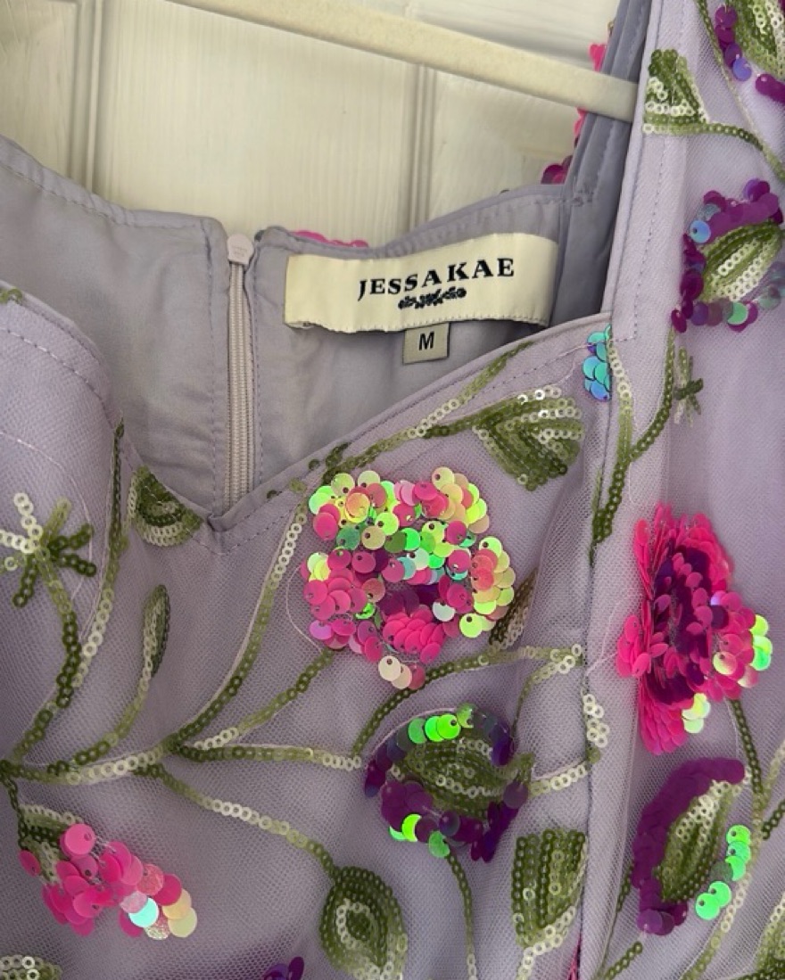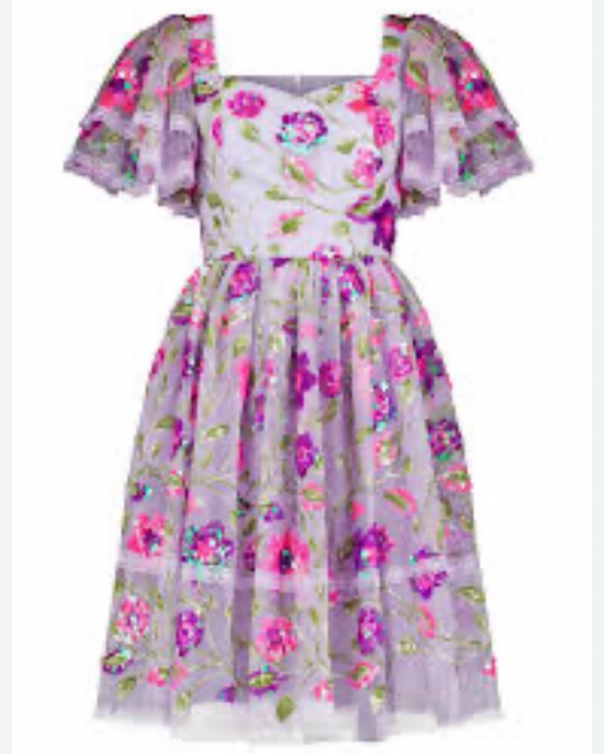 This stunning midi dress features a vibrant floral print and shimmering sequin embellishments, perfect for a garden party or special occasion.