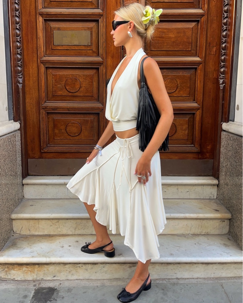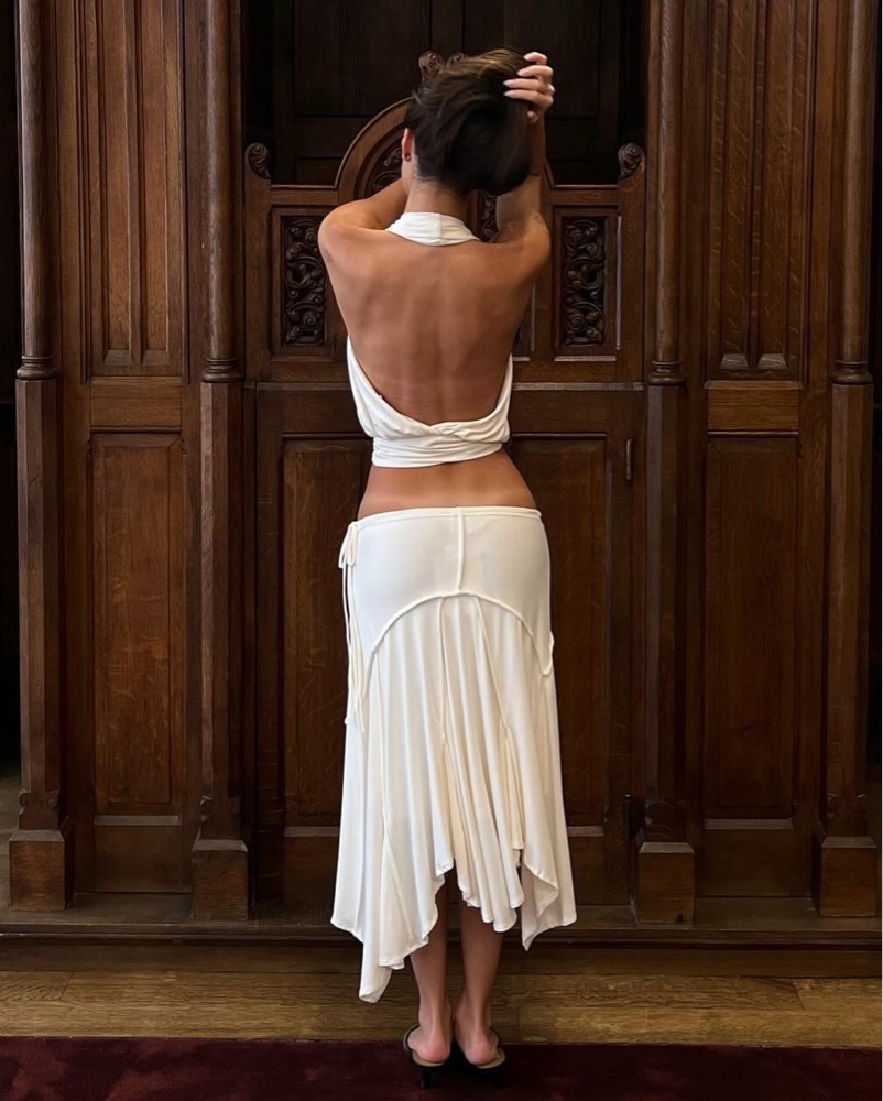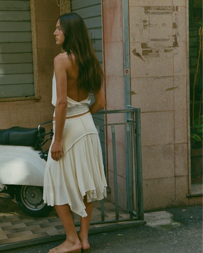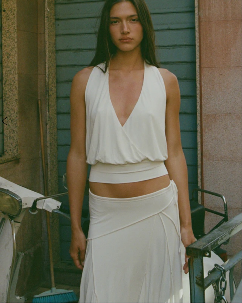 cutest set - i have two of these if this is rented’ sharni top and skirt in off white. Halter open back top and midi-length skirt designed to be worn low on the hips, featuring an adjustable tie waistband - Top small, skirt xS! DRY CLEAN RETURN REQUIRED ***